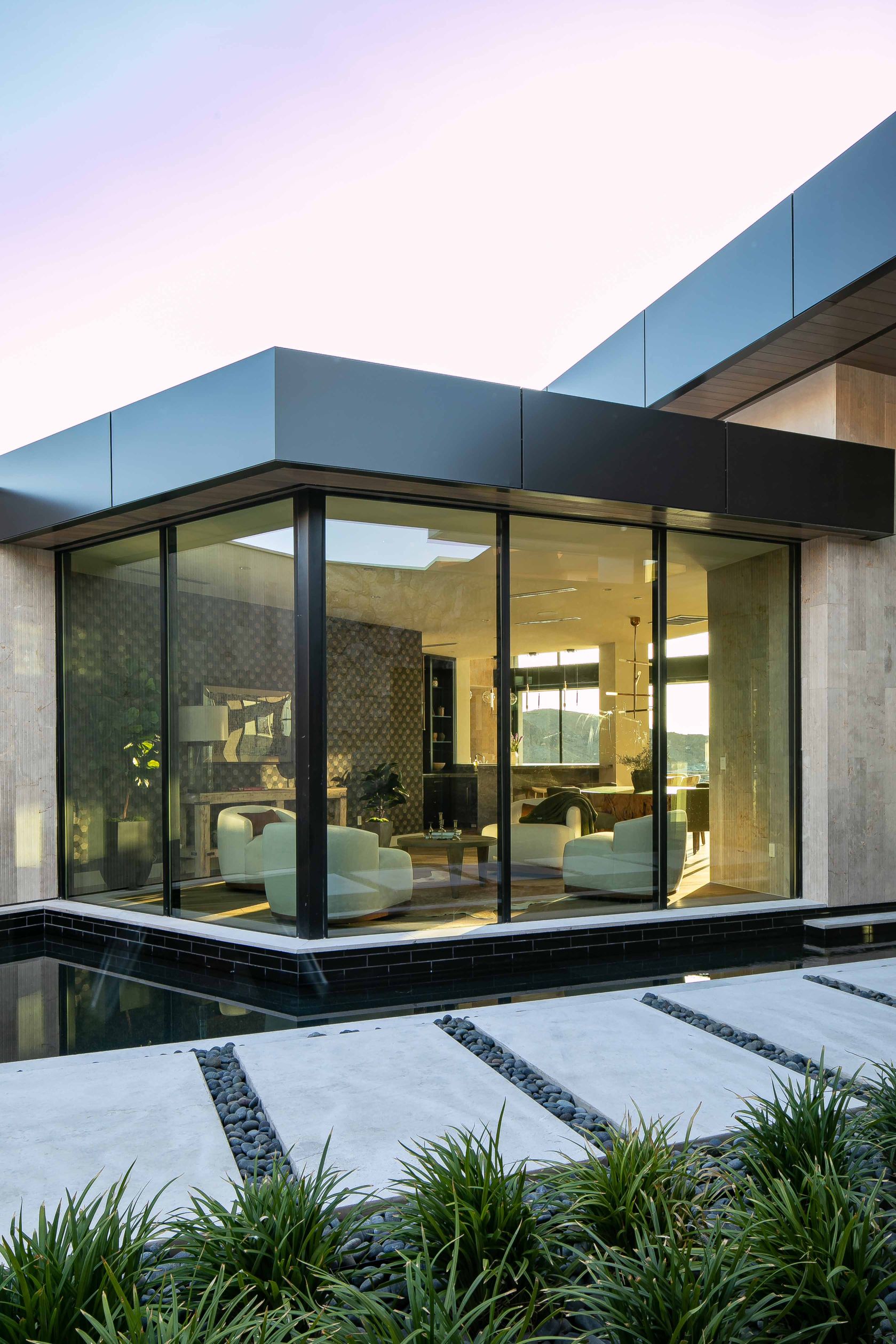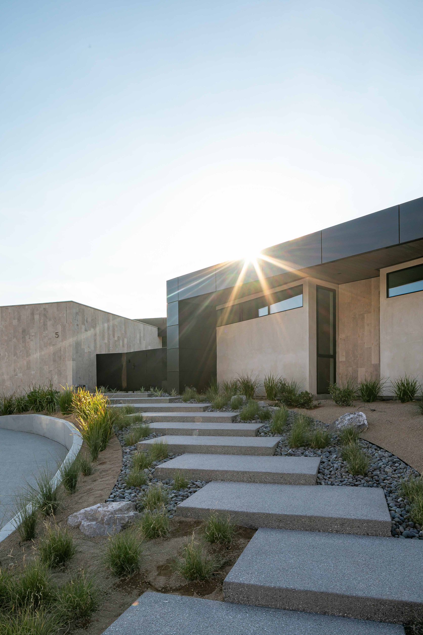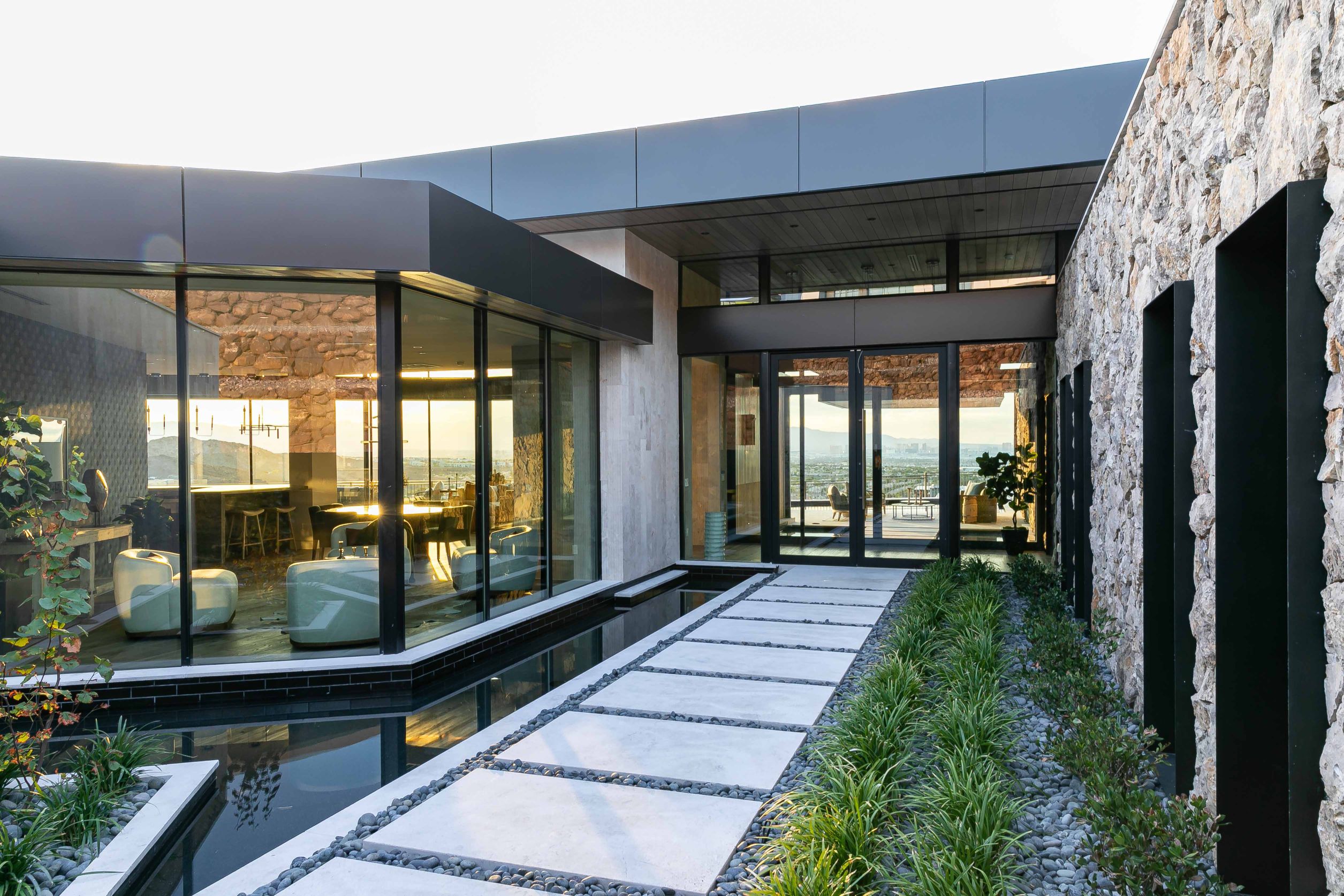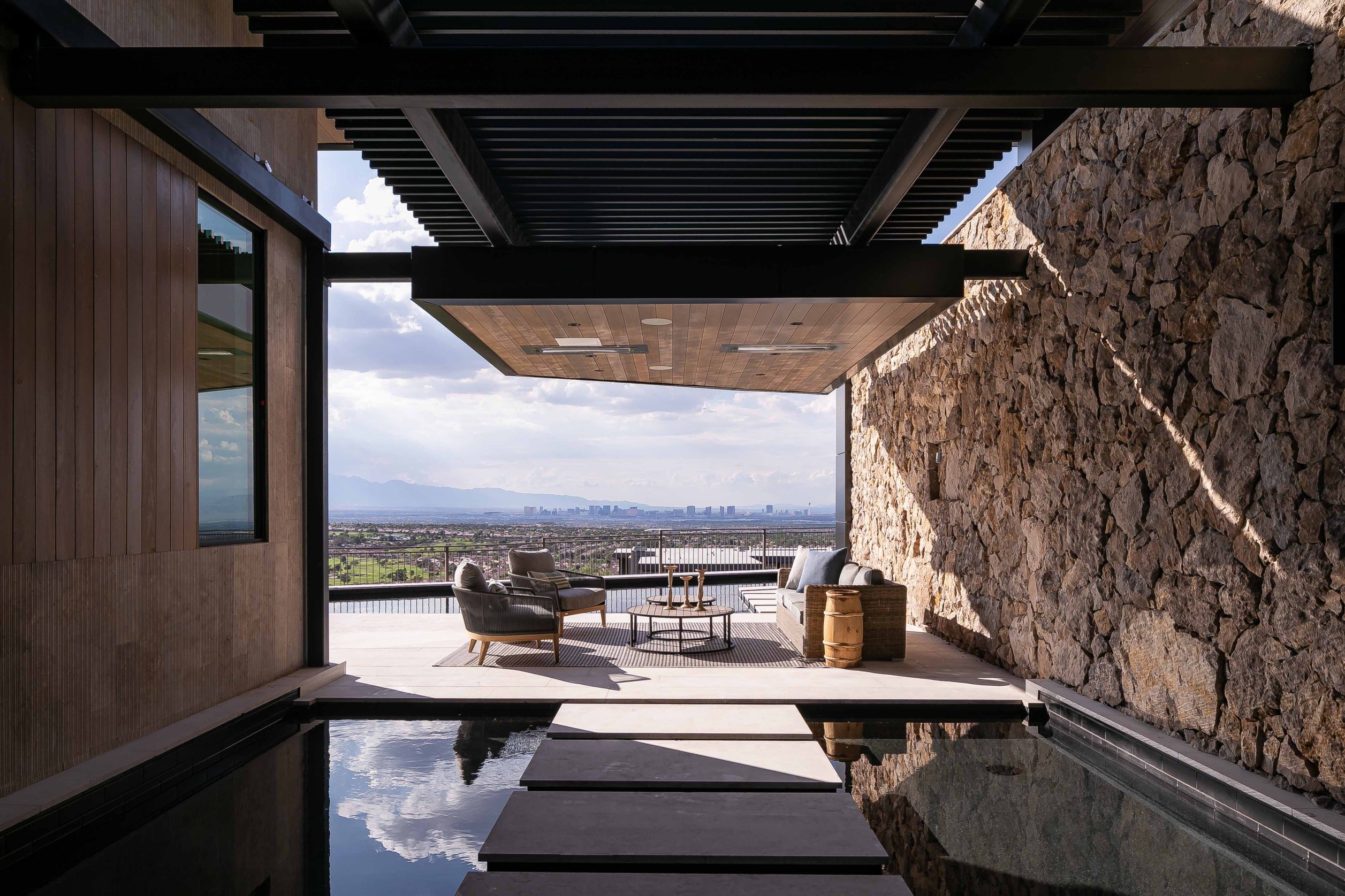 Las Vegas, NevadaCloud chaser is a contemporary home in the foothills outside of Las Vegas. While it offers expansive views of the entire Las Vegas Valley, including the entire Vegas Strip, mountains, desert, and surrounding communities, there were several challenges to maximize these potential views. The entry to the residence is oriented and centered to frame the entire Strip through sliding glass doors and walls. Circulation was developed carefully around this entry moment; the visitor first encounters a meandering boulder path that takes them across the front yard, a gated courtyard complete with a specimen tree and water feature, and a floating trellis structure that frames an outdoor living space adjacent to the pool, capturing reflections from the Strip at night.