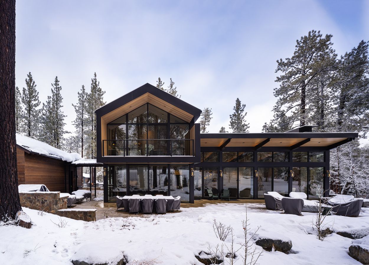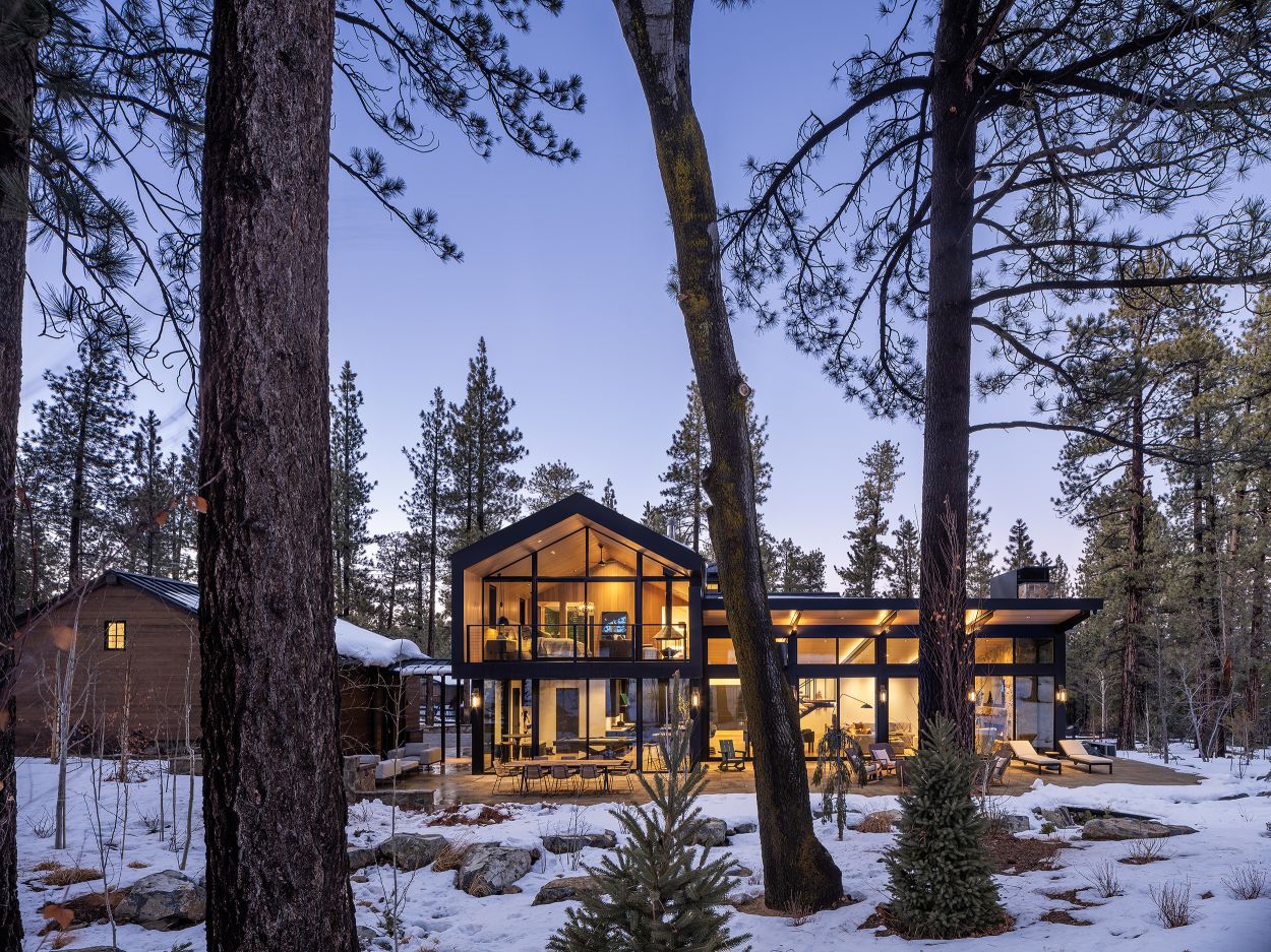 Located adjacent to Snow Summit, the development consists of a primary residence, two private cabins, and a glass pavilion.