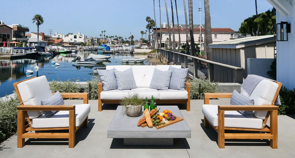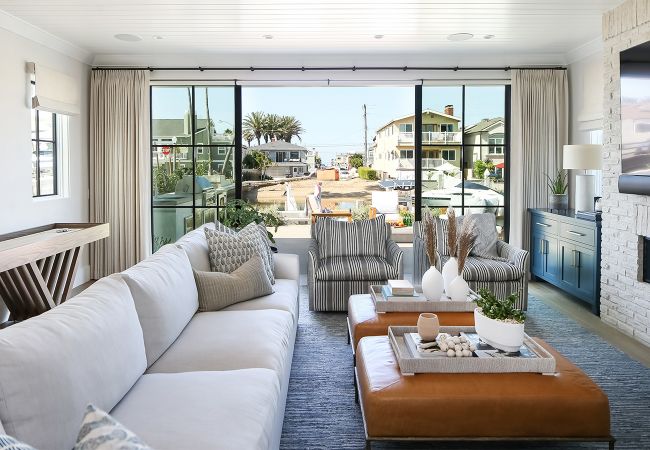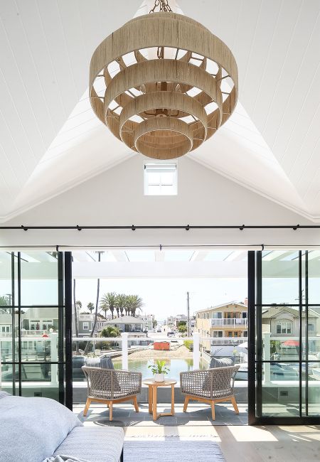 The main living space opens directly up to the channel, with large sliding glass doors creating well-lit, indoor/outdoor living space