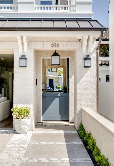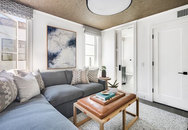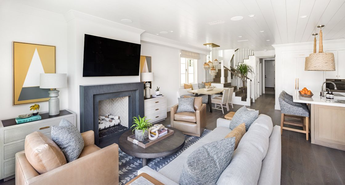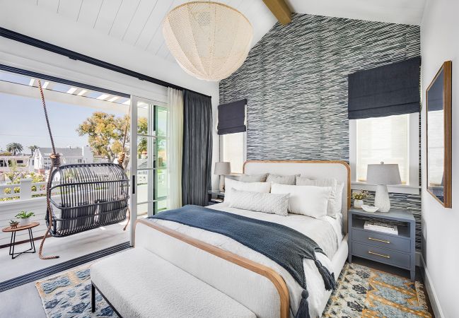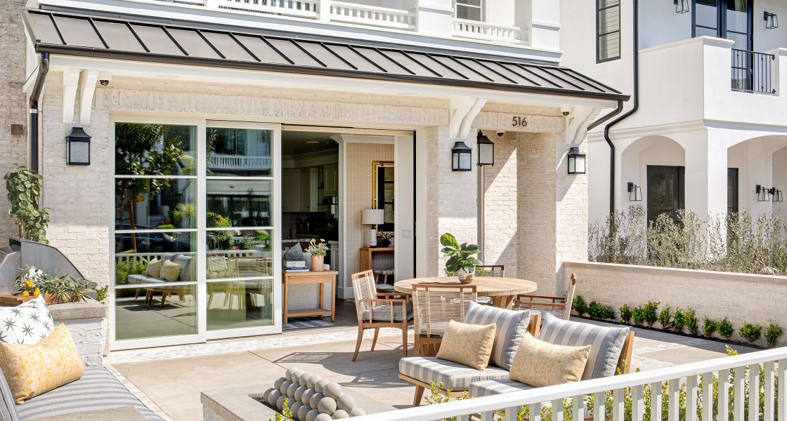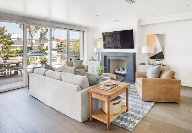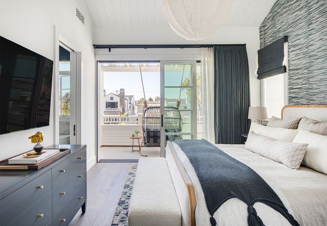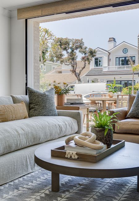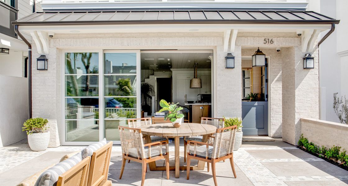Corona Del Mar, CAThis traditional home in Corona Del Mar defies its smaller lot by using an open floor plan, nook dining room seating, and sliding glass doors that connect the main room to the outdoor patio to create a highly-efficient and comfortable living space. The traditional white overhang on the second floor and light brick coloring match the beachy context of the community around it, while bolder interior design accents provide a modern flare. On the second floor, the master bedroom and bath share the streetfront, using large windows and sliding glass doors for ample natural ventilation and light, while the depth of the outdoor deck provides privacy for the homeowner within.