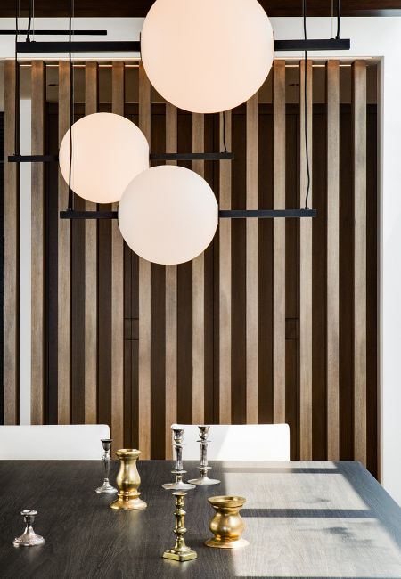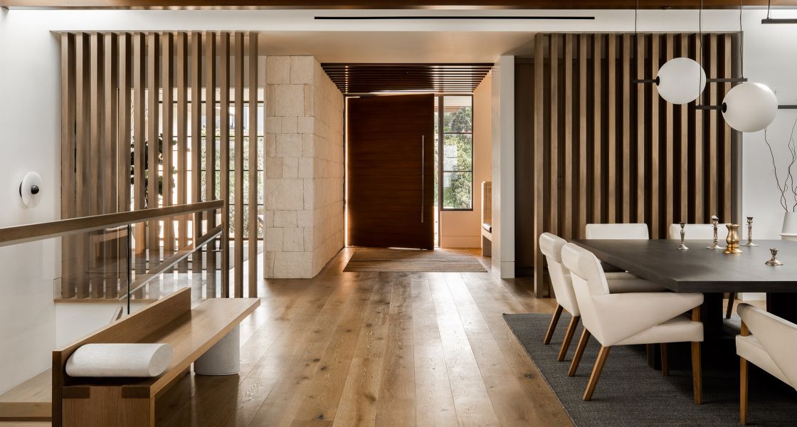 AN INTERIOR TRELLIS FRAMES THE DINING ROOM AND THE ENTRY TO THE STAIRWELL, drawing focus to the center of the home and CREATING A SPACE THAT FEELS CONNECTED.