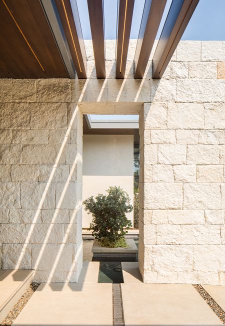 in A gracious ENTRY AND FOYER, Cedar beams and a stone wall extend from the outside in to embrace a seamless connection with nature.