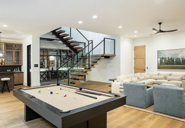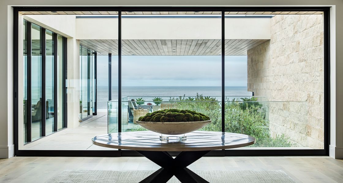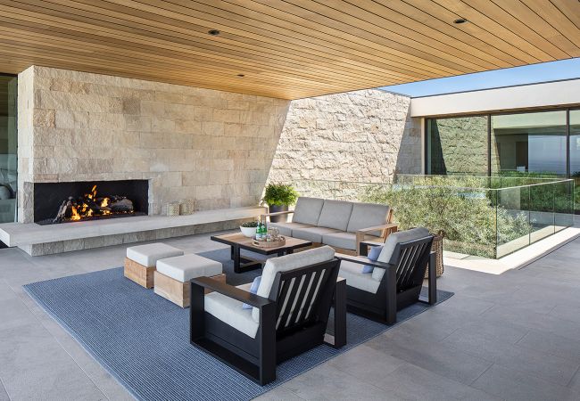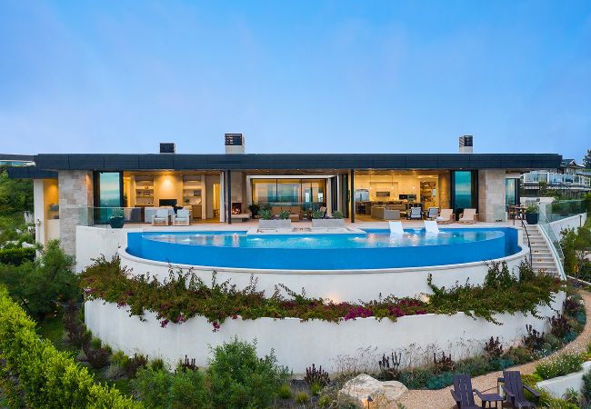 In the backyard, a semi-circular pool, nearly 60 feet in diameter, provides the perfect spot to take in the stunning sunsets and faces unobstructed views of Catalina Island. Set into the backyard deck, a sunken outdoor lounge maintains the sightlines from within the home while increasing the functional outdoor space.