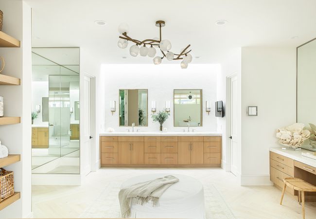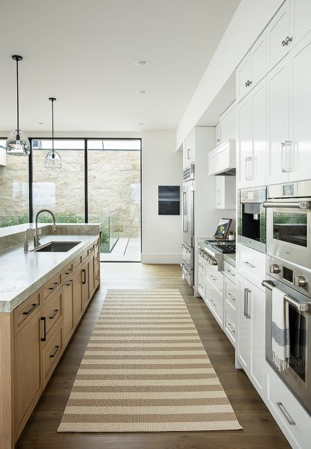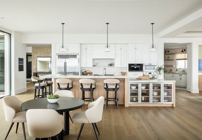 In the kitchen, minimalist interior design ebbs into a more homey, casual feel, with light wood features and white cabinetry, softening the home
