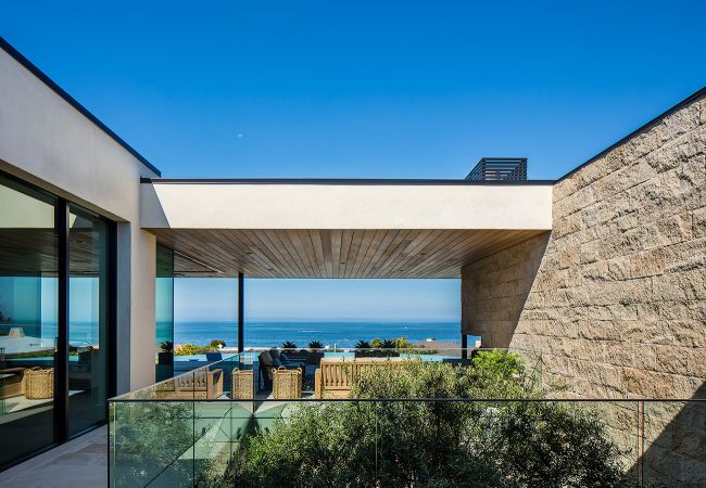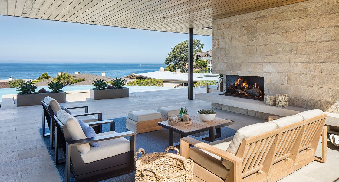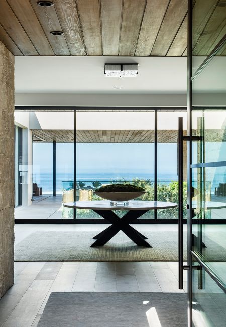 Newport Beach, CAThis modern coastal home, located in the Cameo Shores neighborhood in Newport Beach, CA, boldly embodies the concept of outdoor living characteristic of the Southern California lifestyle. Just 400 feet from some of Newport Beach's most beautiful and coveted coastline, the home blends light textured stone with warm wood ceilings, punctuated with black metal accents and finishes. Boasting a massive outdoor deck overlooking both pool and ocean beyond, the home's covered outdoor living space is made to feel even more expansive through corner glass walls which "disappear," erasing the boundary between both the main room and kitchen with the deck. To the front of the home, a deep, triangular overhang leading up to the home's front door generates an un-missable curbside effect.