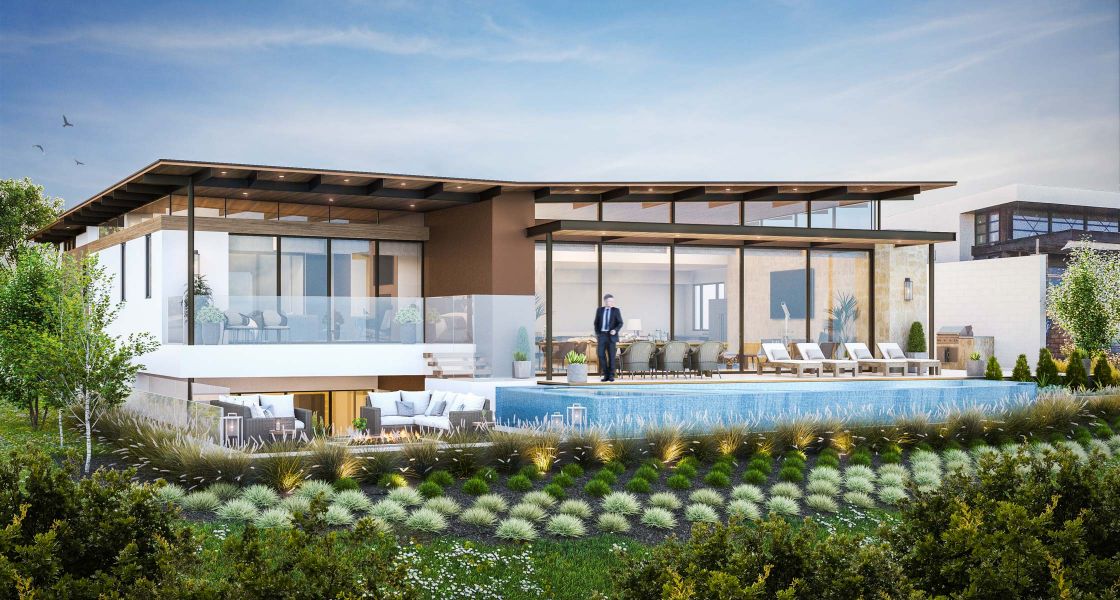 The residence will be of a ‘modern style’ composed with a balance of materials that aesthetically complement each other to accentuate the massing and bring balance to the architecture. The materials proposed are natural wood cedar siding, natural stone, light stucco, exposed steel structural members with T&G soffits and metal wall cladding. Some of the metal panels will be perforated and span over portions of the windows to provide privacy while still filtering light in. A green roof is proposed over the front garage which brings down the scale at the street while providing a soft attractive green space that will integrate into the surrounding landscape.