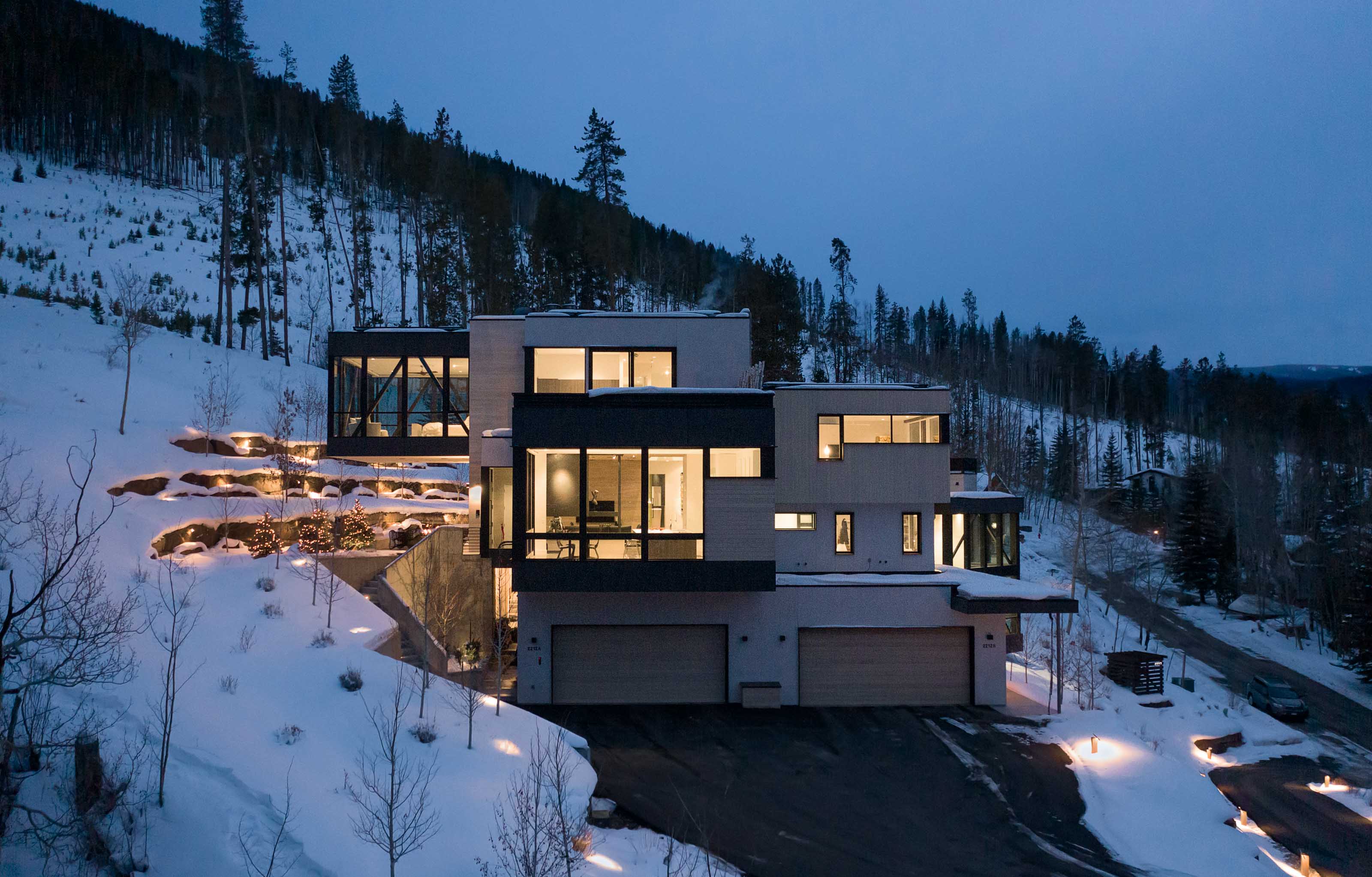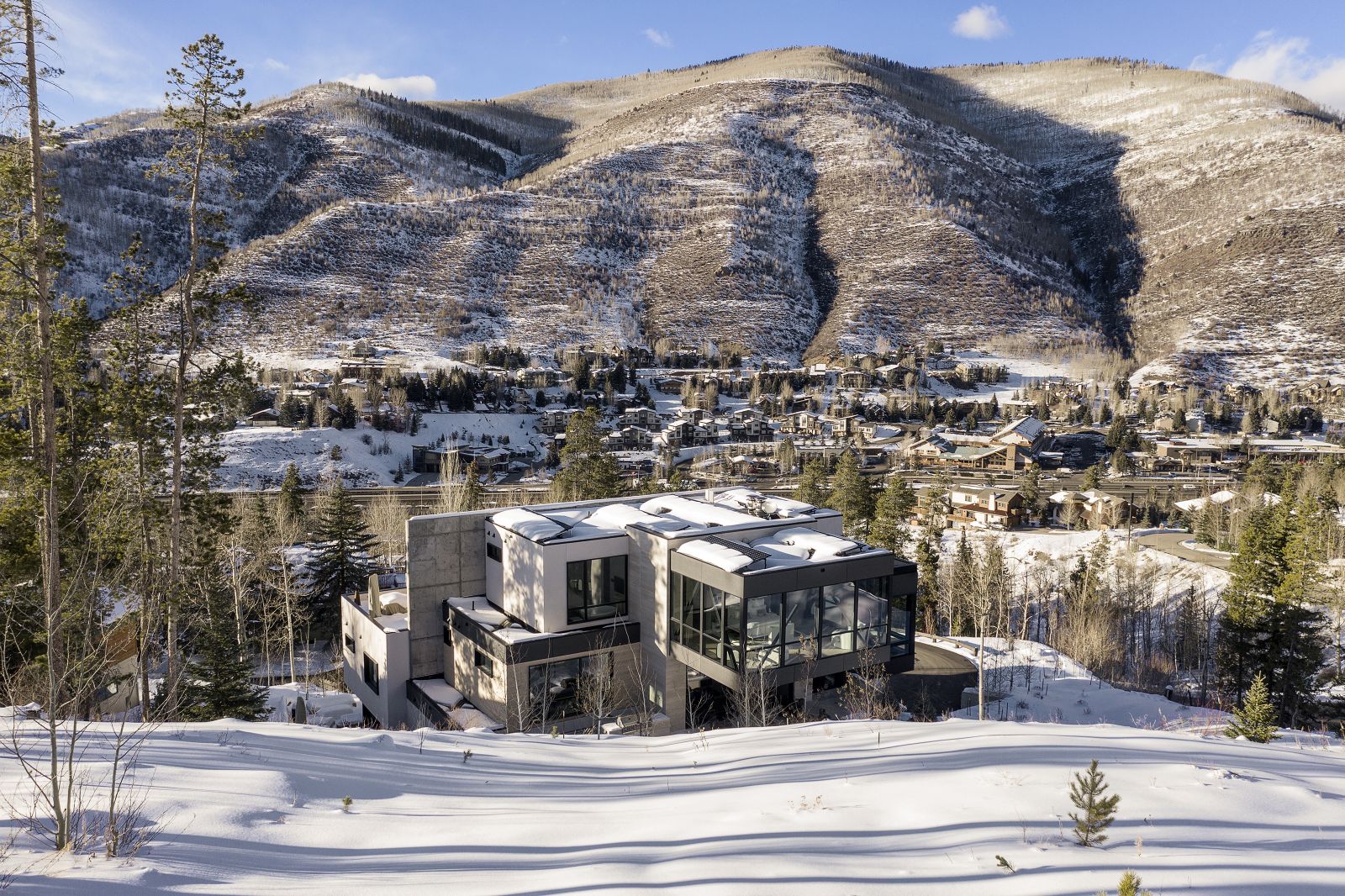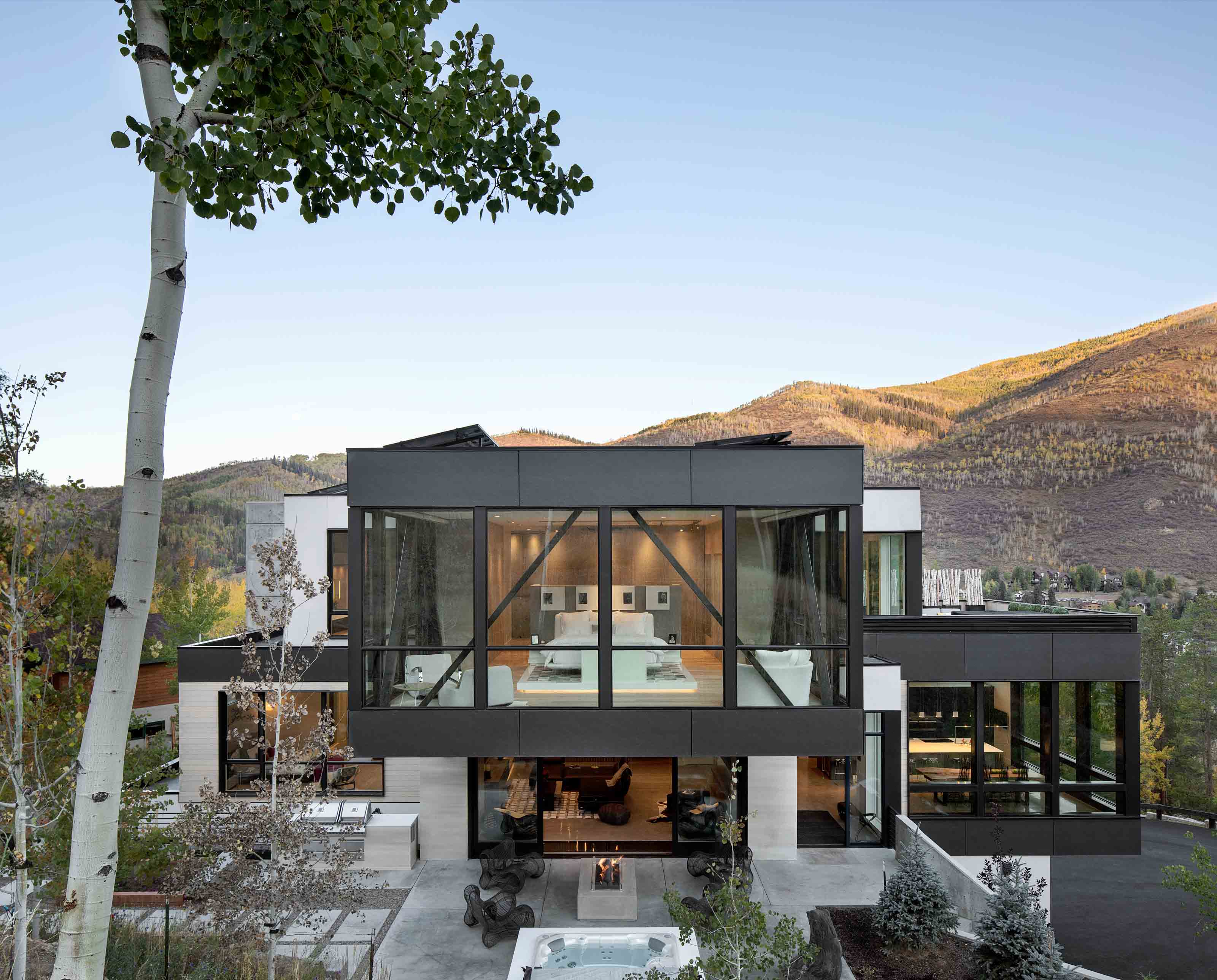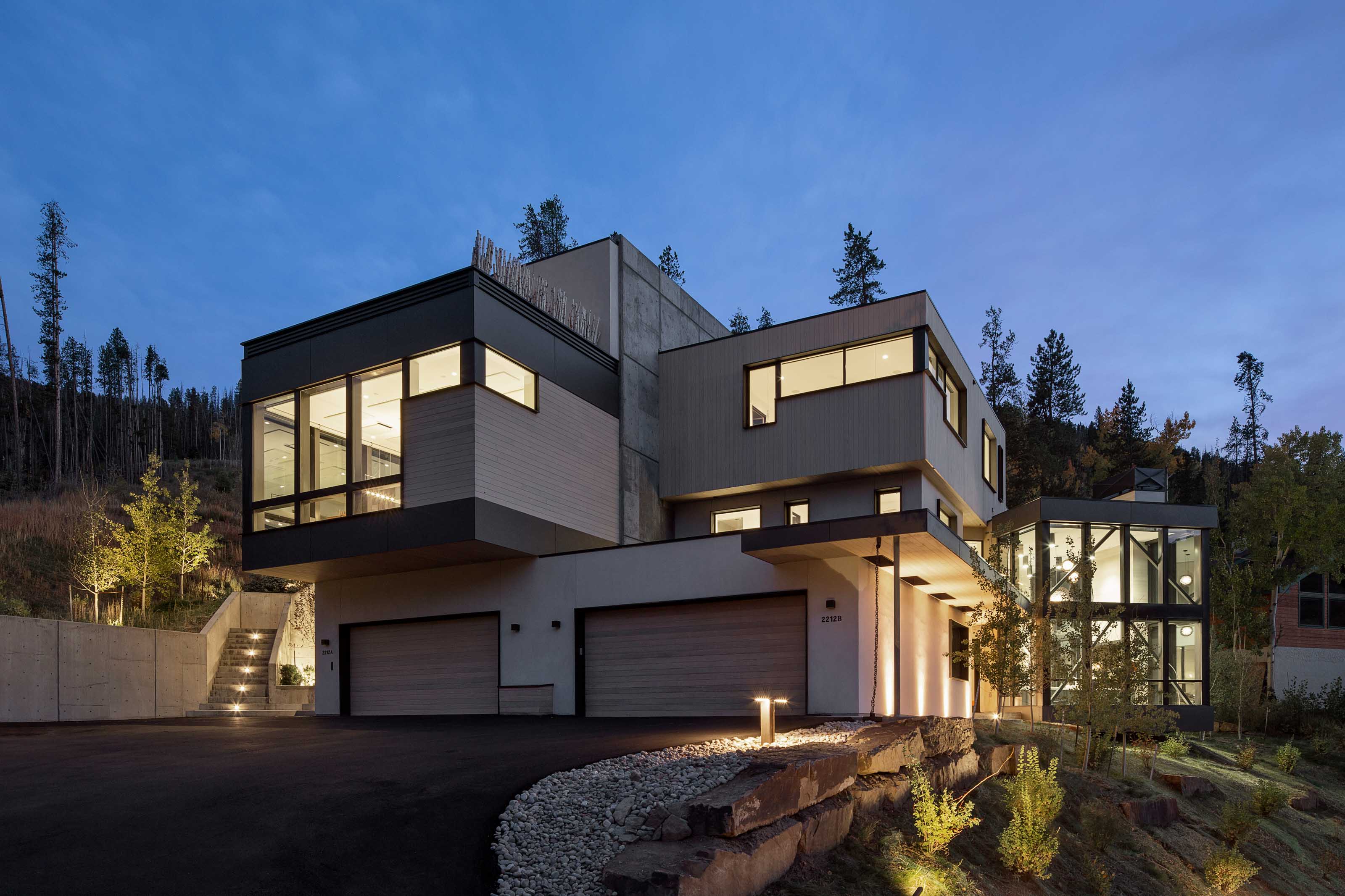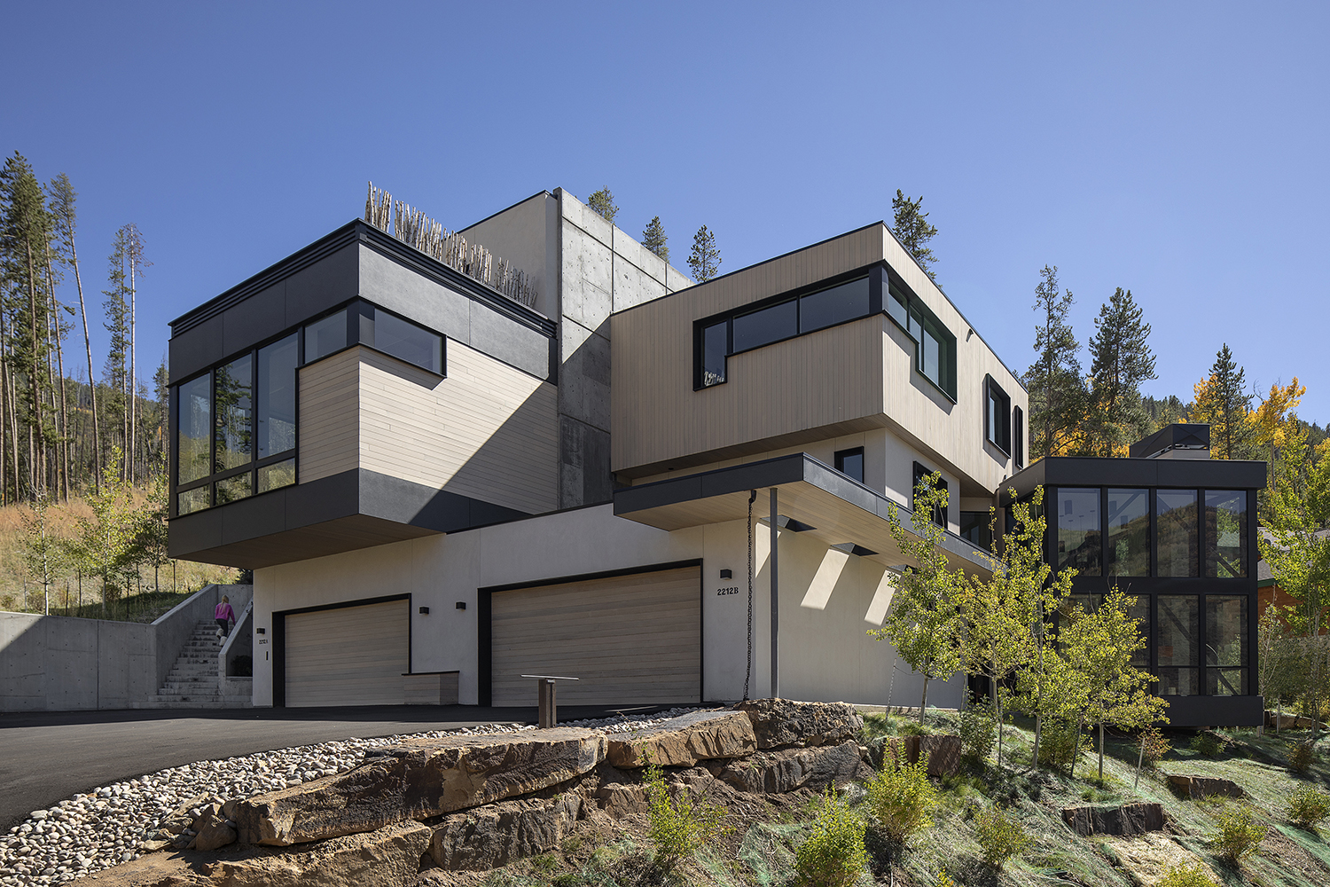 Vail, COThis mountain modern home is situated on a half-acre parcel in the Gore range of the Rocky Mountains. The structure was designed as a duplex home totaling 10,063 s.f. with both units featuring master suites, secondary bedrooms, laundry, kitchen, great room, dining, outdoor patios, and roof decks. The units are separated by a large concrete demising wall 30' tall and 12" thick. The form of the structure takes on a modern design with cubes that stack and cantilever, levitating off the structure. Views of the West Vail Valley can be enjoyed from most rooms of each unit.