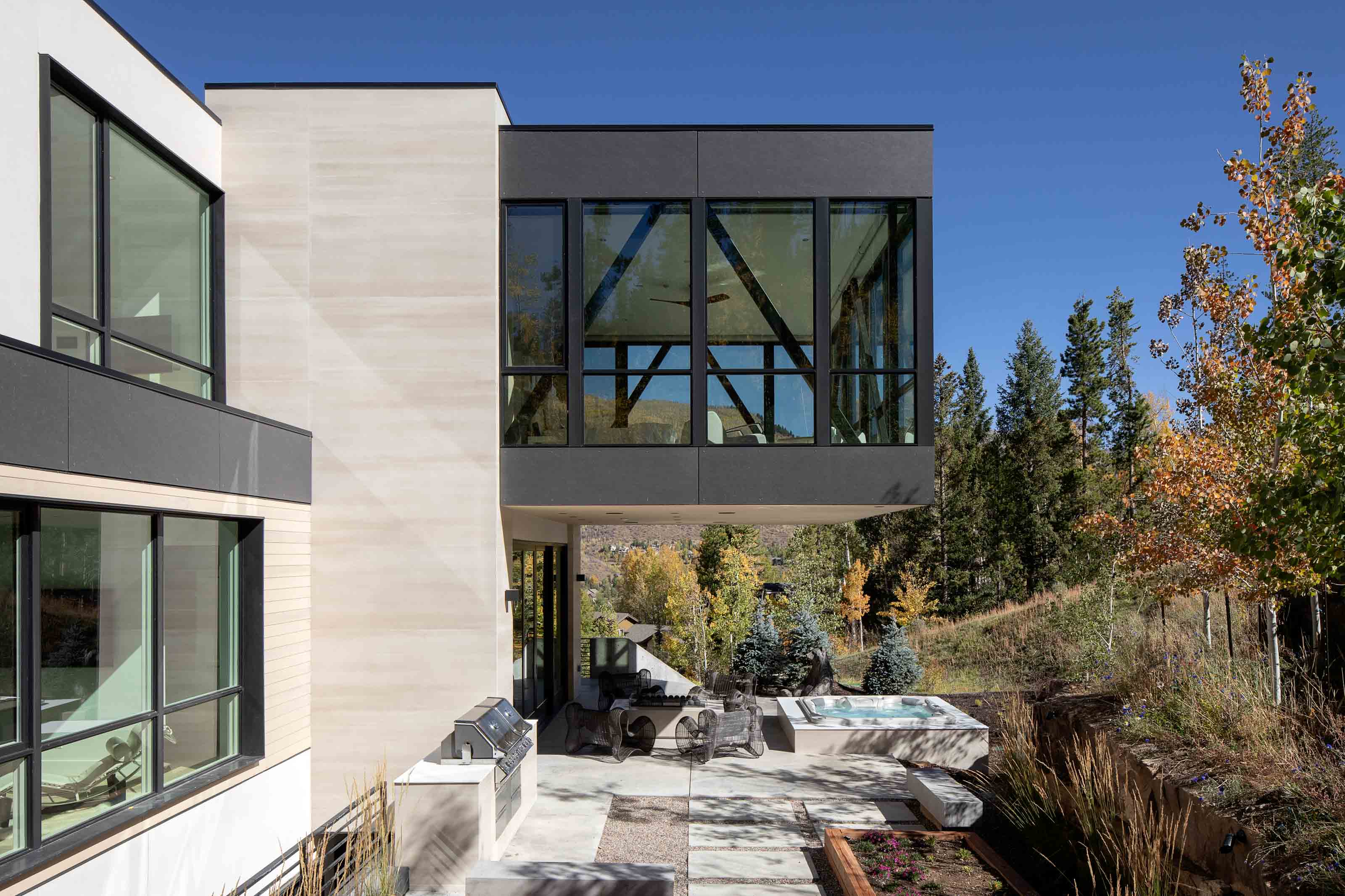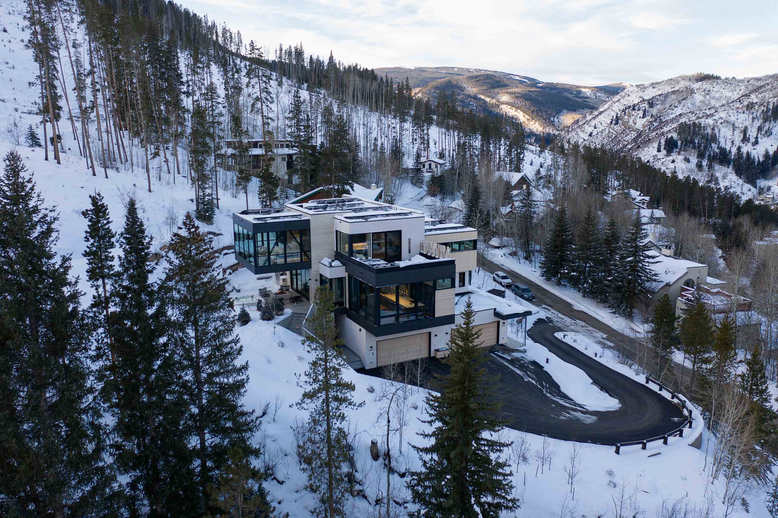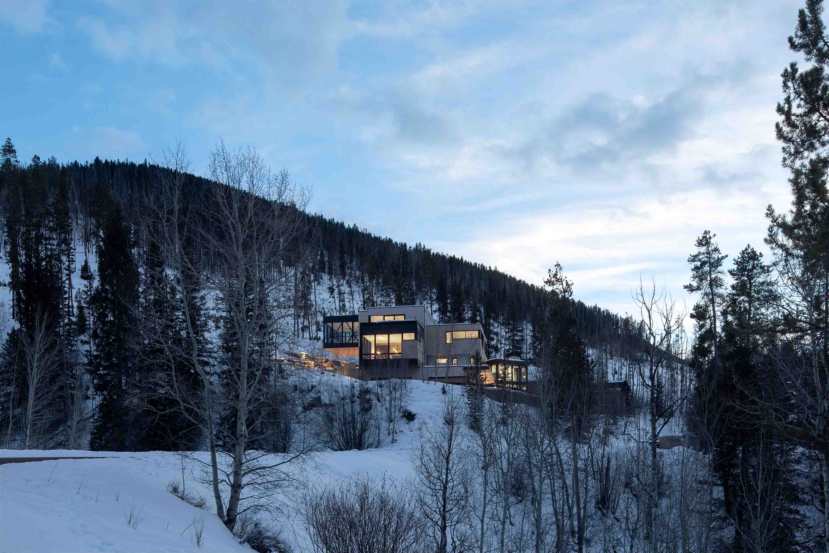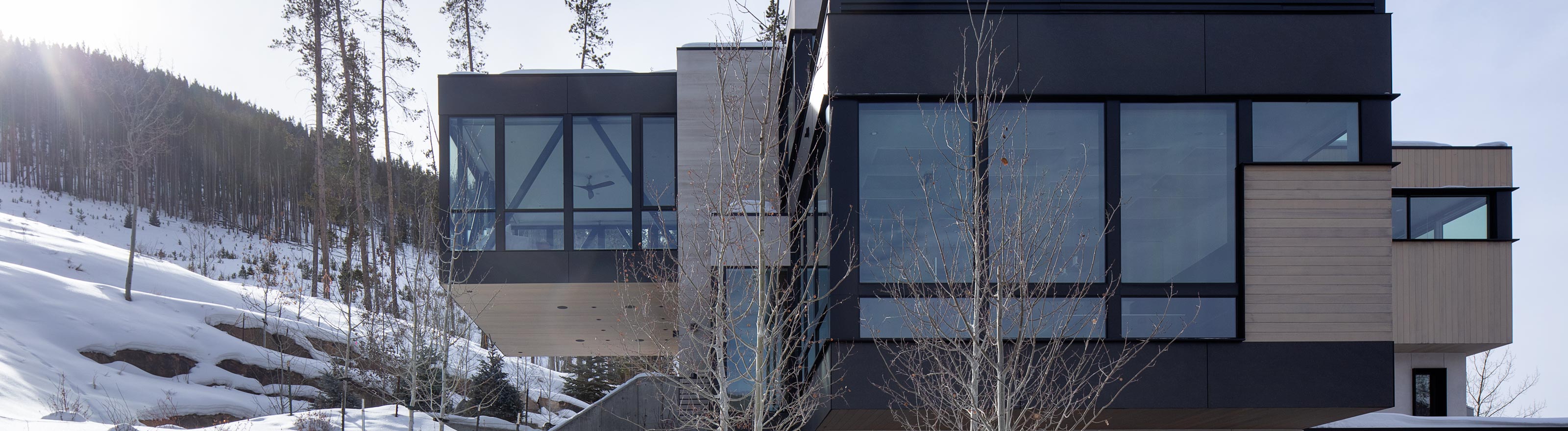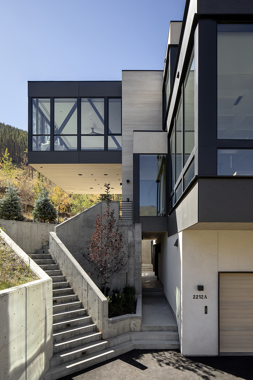 Vail, COThis mountain modern home is situated on a half-acre parcel in the Gore range of the Rocky Mountains. The structure was designed as a duplex home totaling 10,063 s.f. with both units featuring master suites, secondary bedrooms, laundry, kitchen, great room, dining, outdoor patios, and roof decks. The units are separated by a large concrete demising wall 30' tall and 12" thick. The form of the structure takes on a modern design with cubes that stack and cantilever, levitating off the structure. Views of the West Vail Valley can be enjoyed from most rooms of each unit.