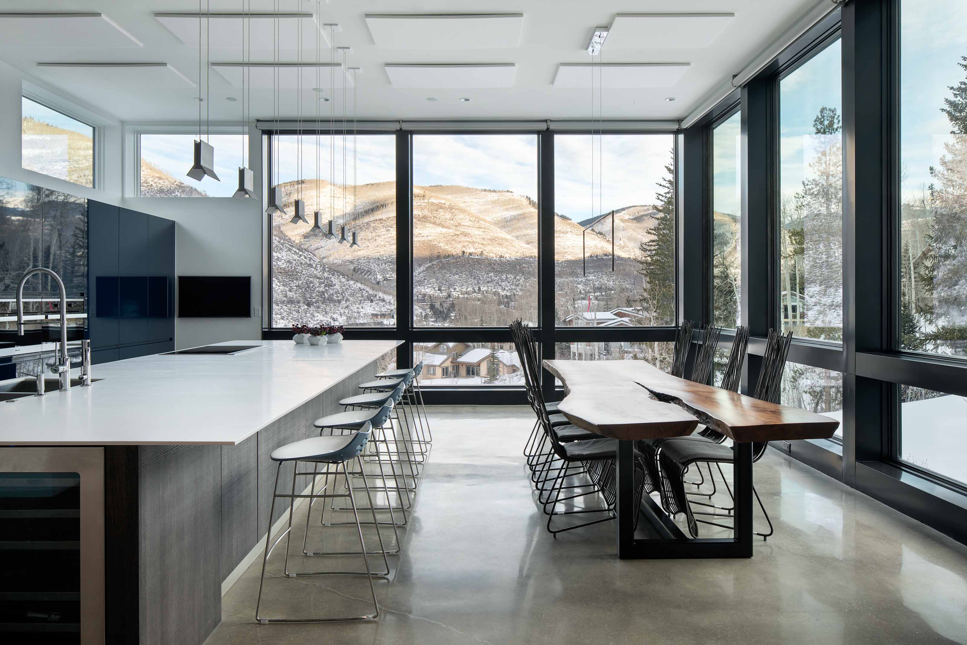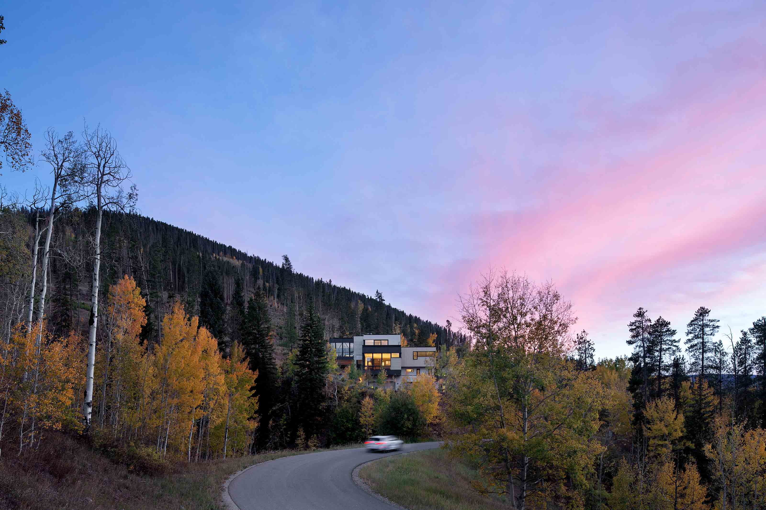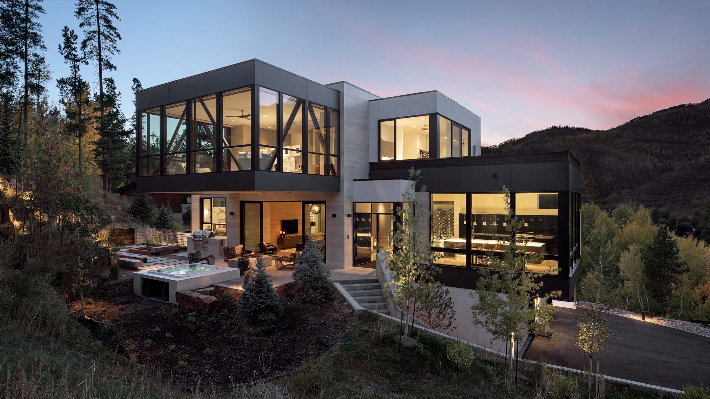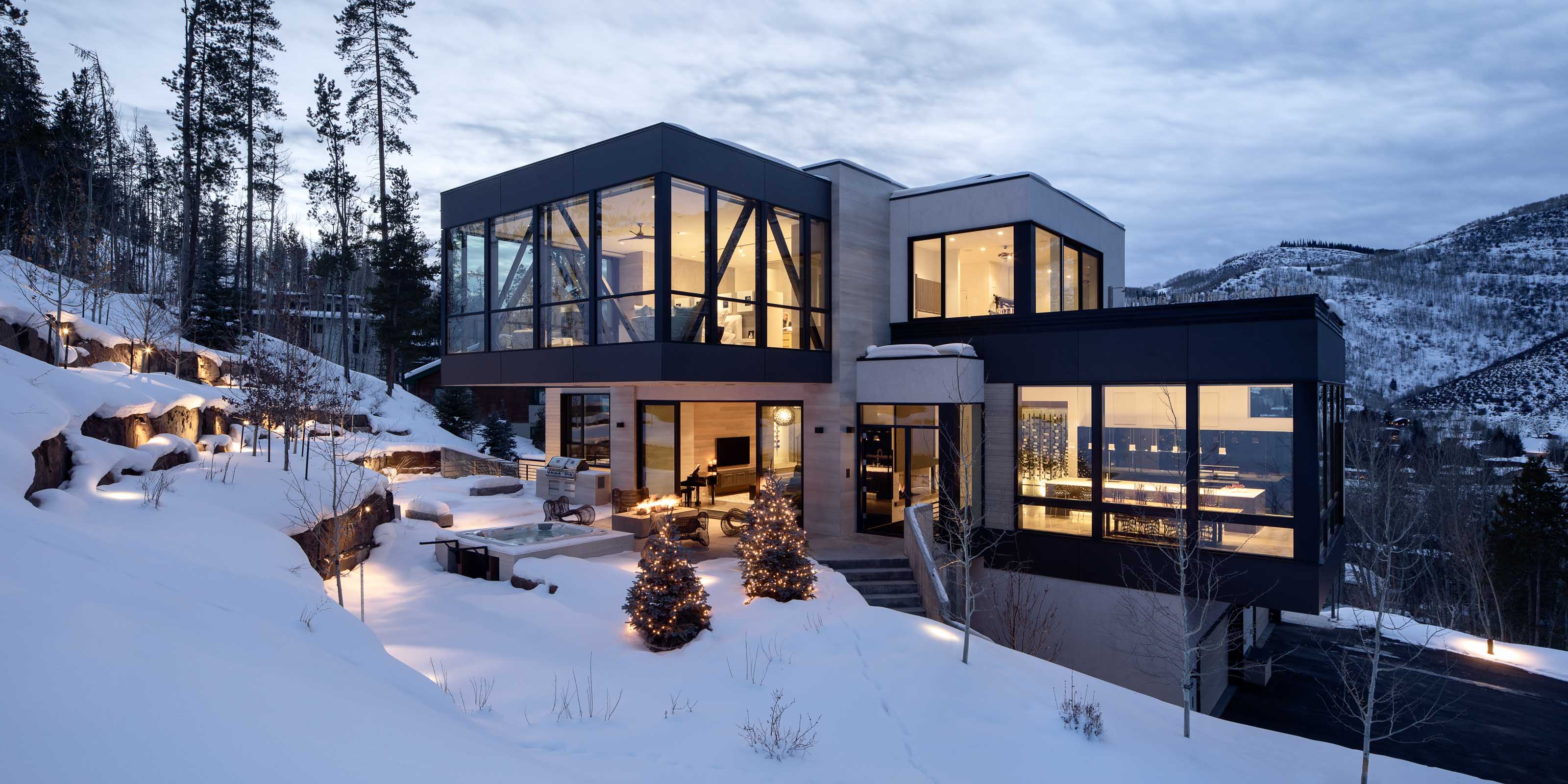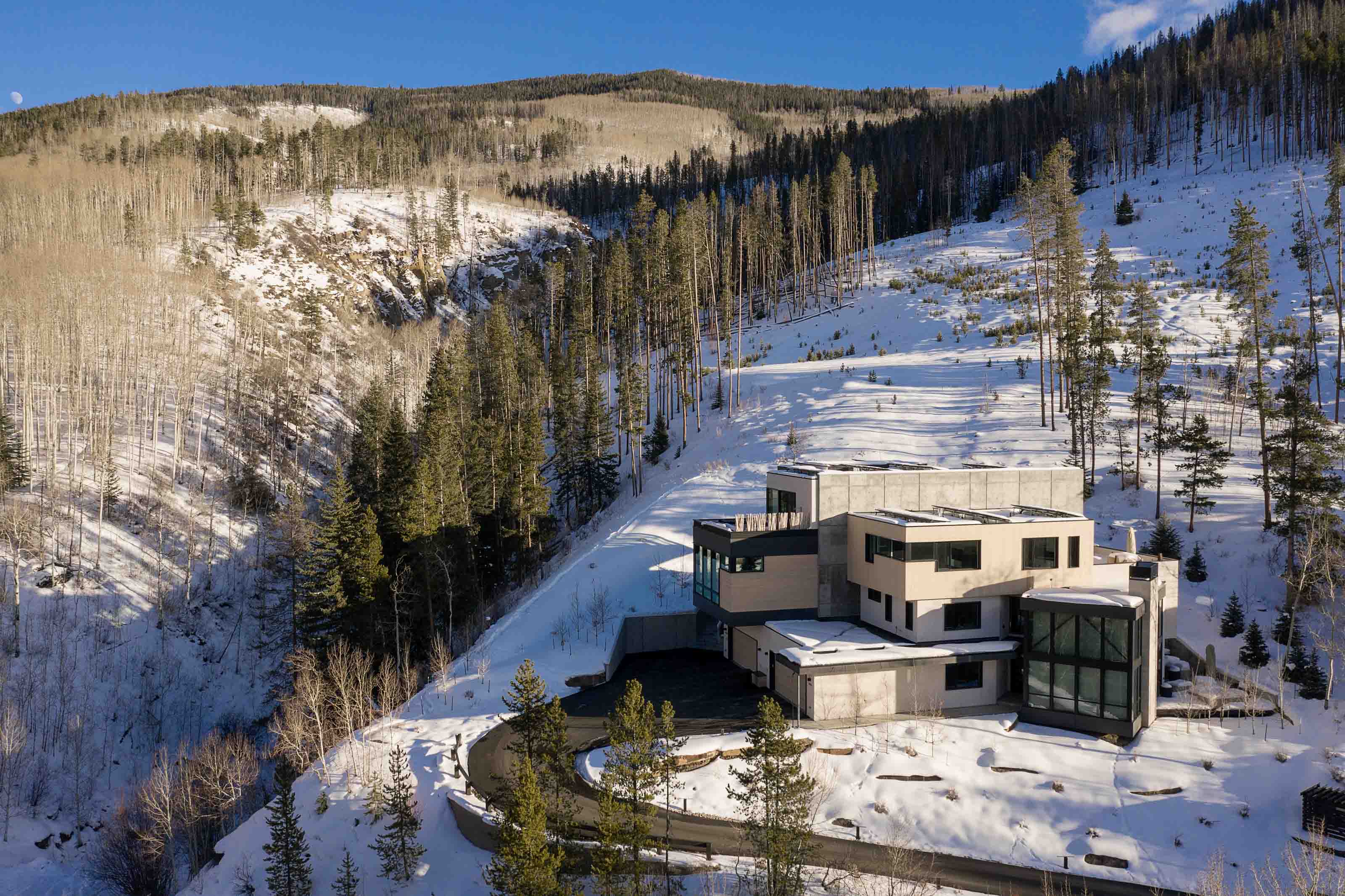 Vail, COThis mountain modern home is situated on a half-acre parcel in the Gore range of the Rocky Mountains. The structure was designed as a duplex home totaling 10,063 s.f. with both units featuring master suites, secondary bedrooms, laundry, kitchen, great room, dining, outdoor patios, and roof decks. The units are separated by a large concrete demising wall 30' tall and 12" thick. The form of the structure takes on a modern design with cubes that stack and cantilever, levitating off the structure. Views of the West Vail Valley can be enjoyed from most rooms of each unit.