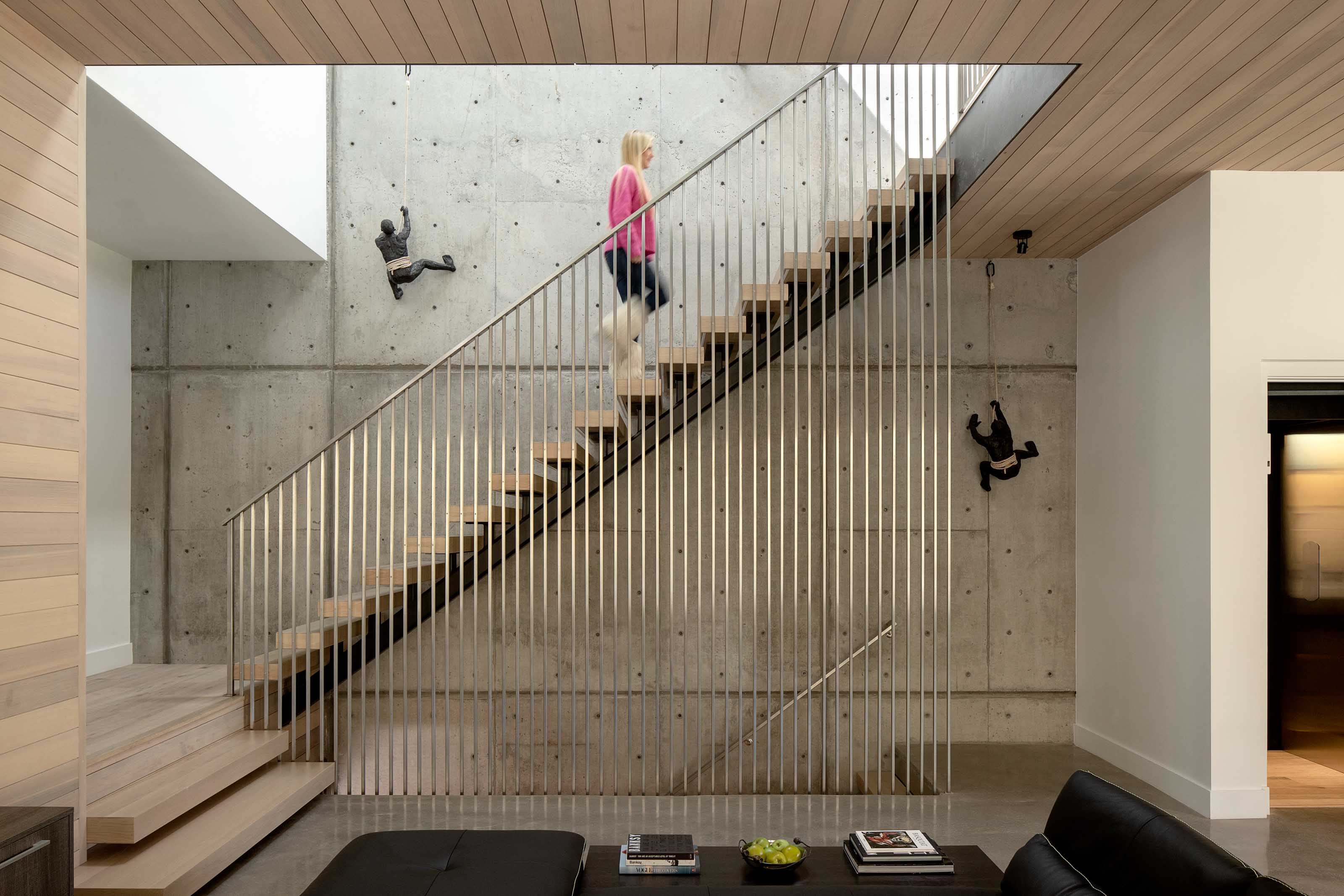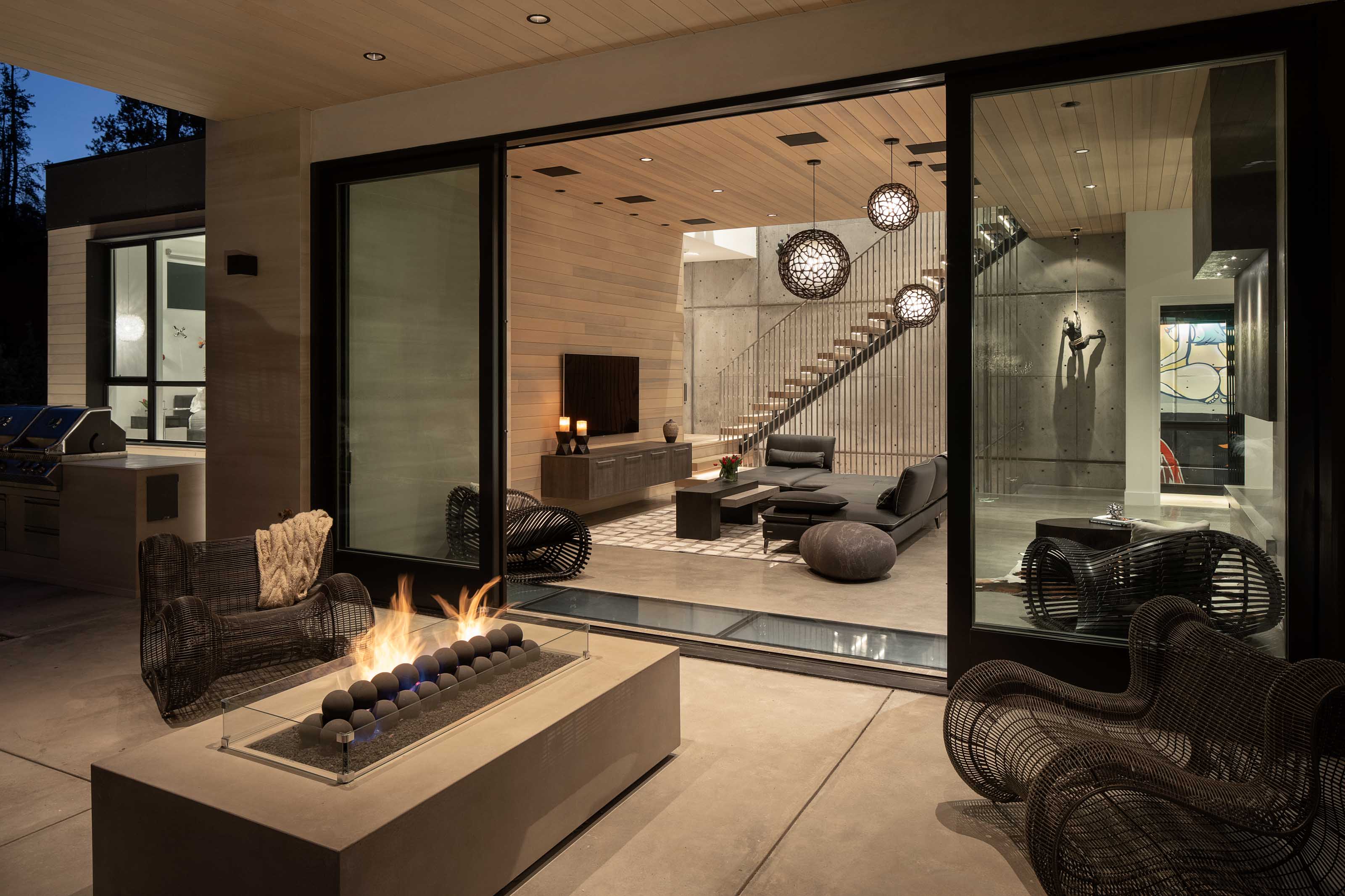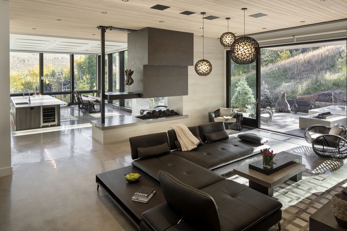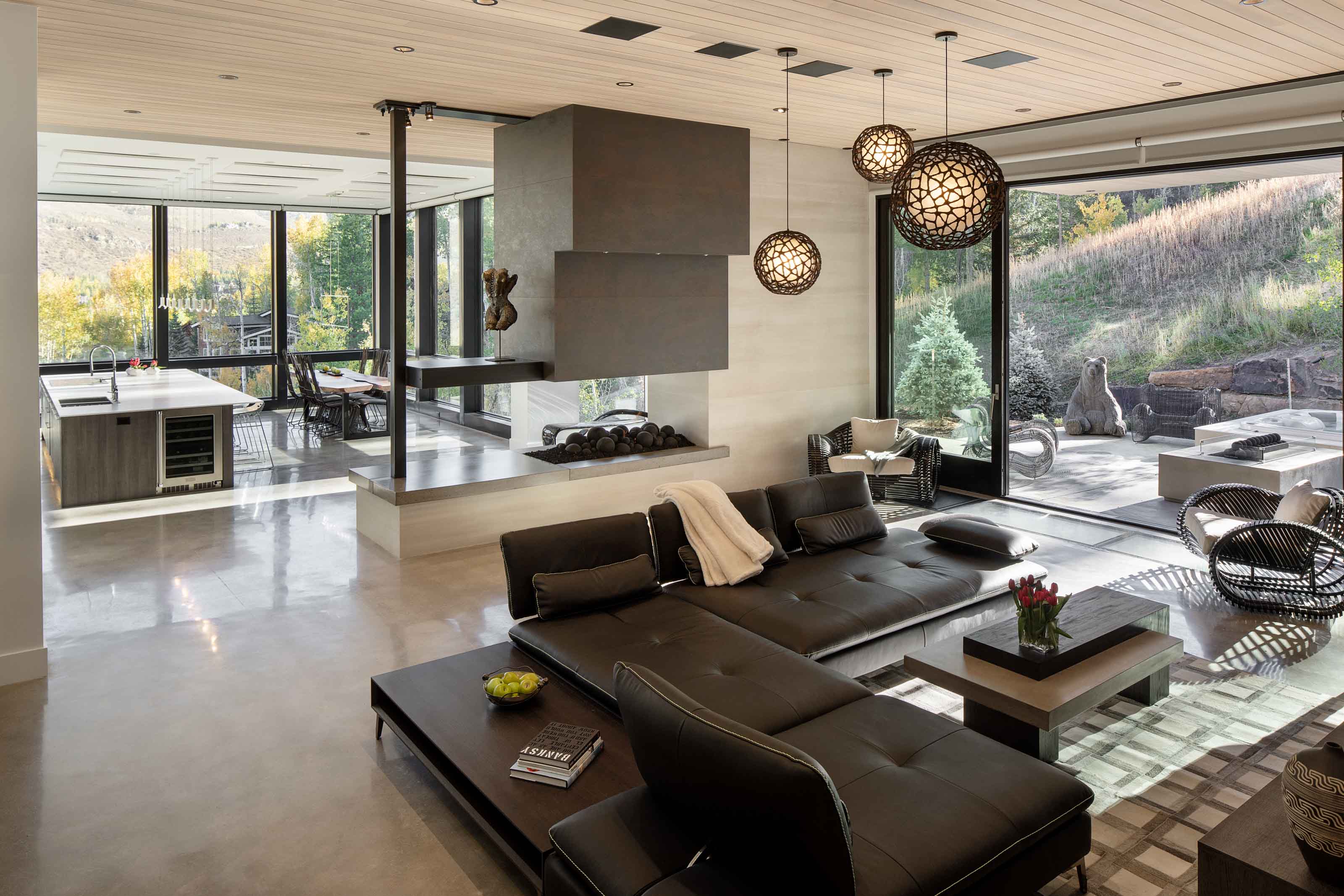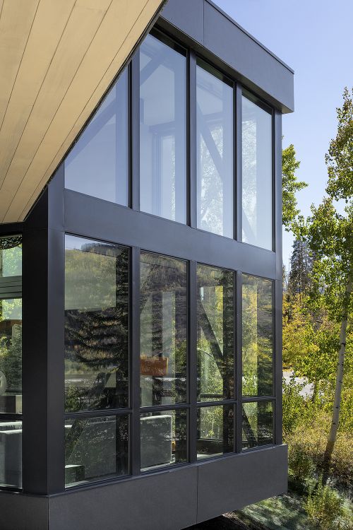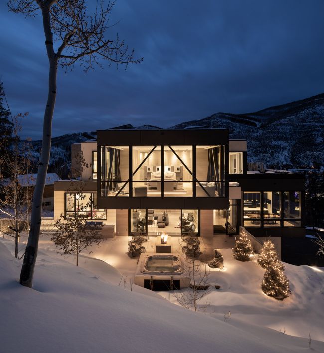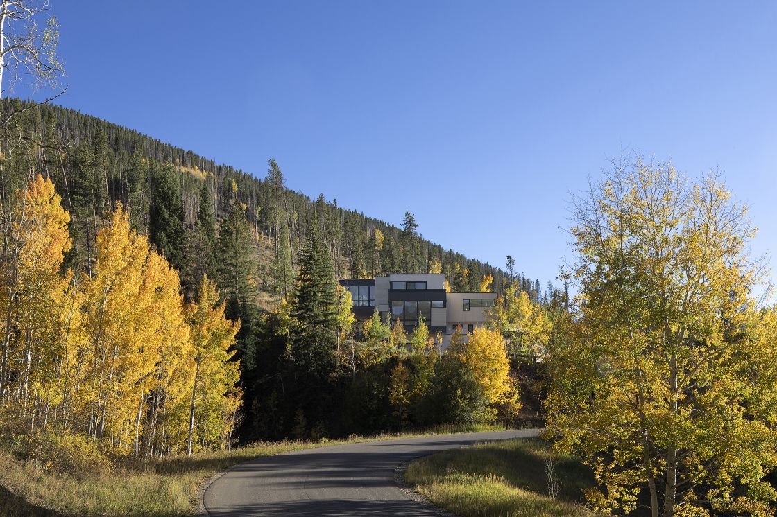 Vail, COThis mountain modern home is situated on a half-acre parcel in the Gore range of the Rocky Mountains. The structure was designed as a duplex home totaling 10,063 s.f. with both units featuring master suites, secondary bedrooms, laundry, kitchen, great room, dining, outdoor patios, and roof decks. The units are separated by a large concrete demising wall 30' tall and 12" thick. The form of the structure takes on a modern design with cubes that stack and cantilever, levitating off the structure. Views of the West Vail Valley can be enjoyed from most rooms of each unit.