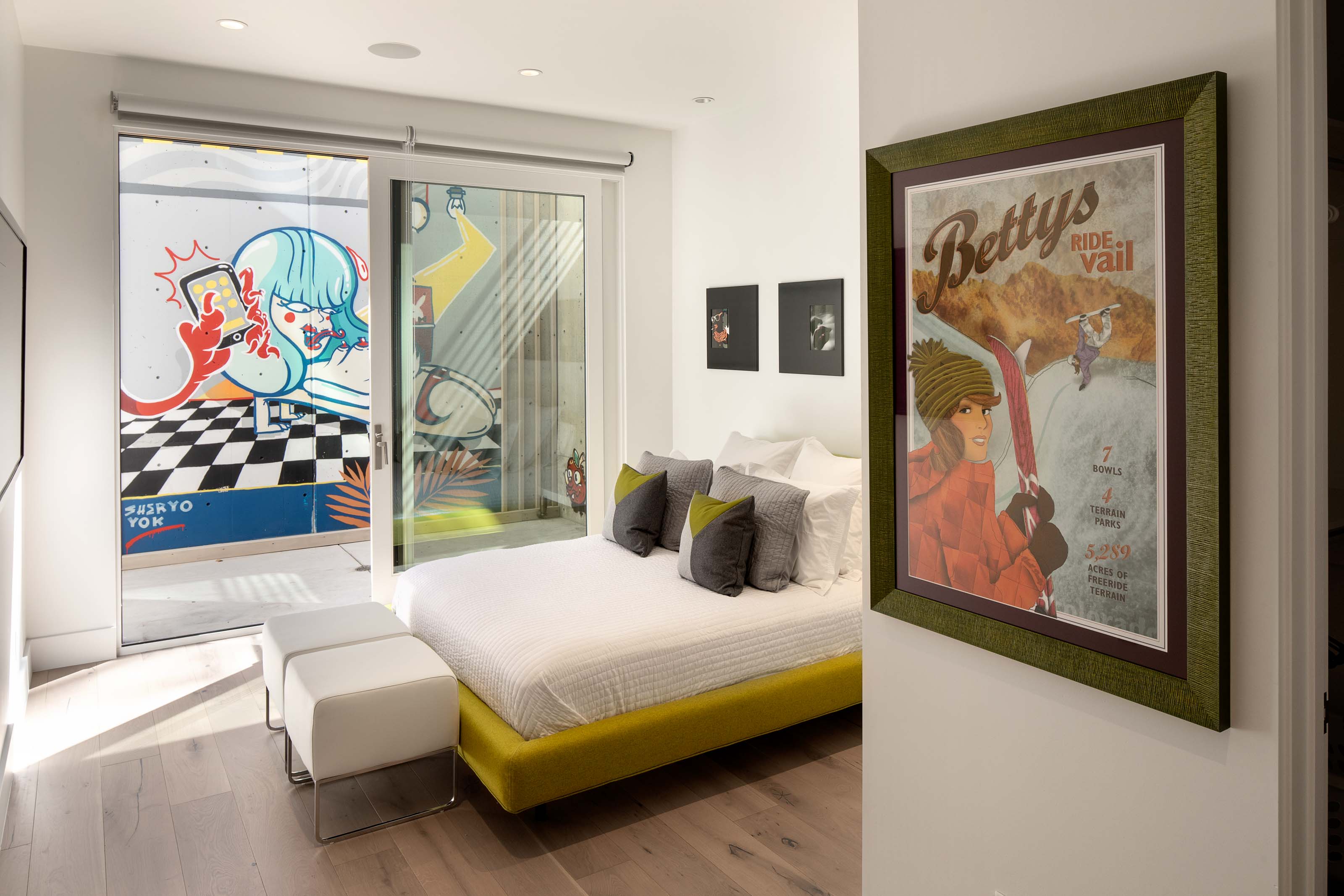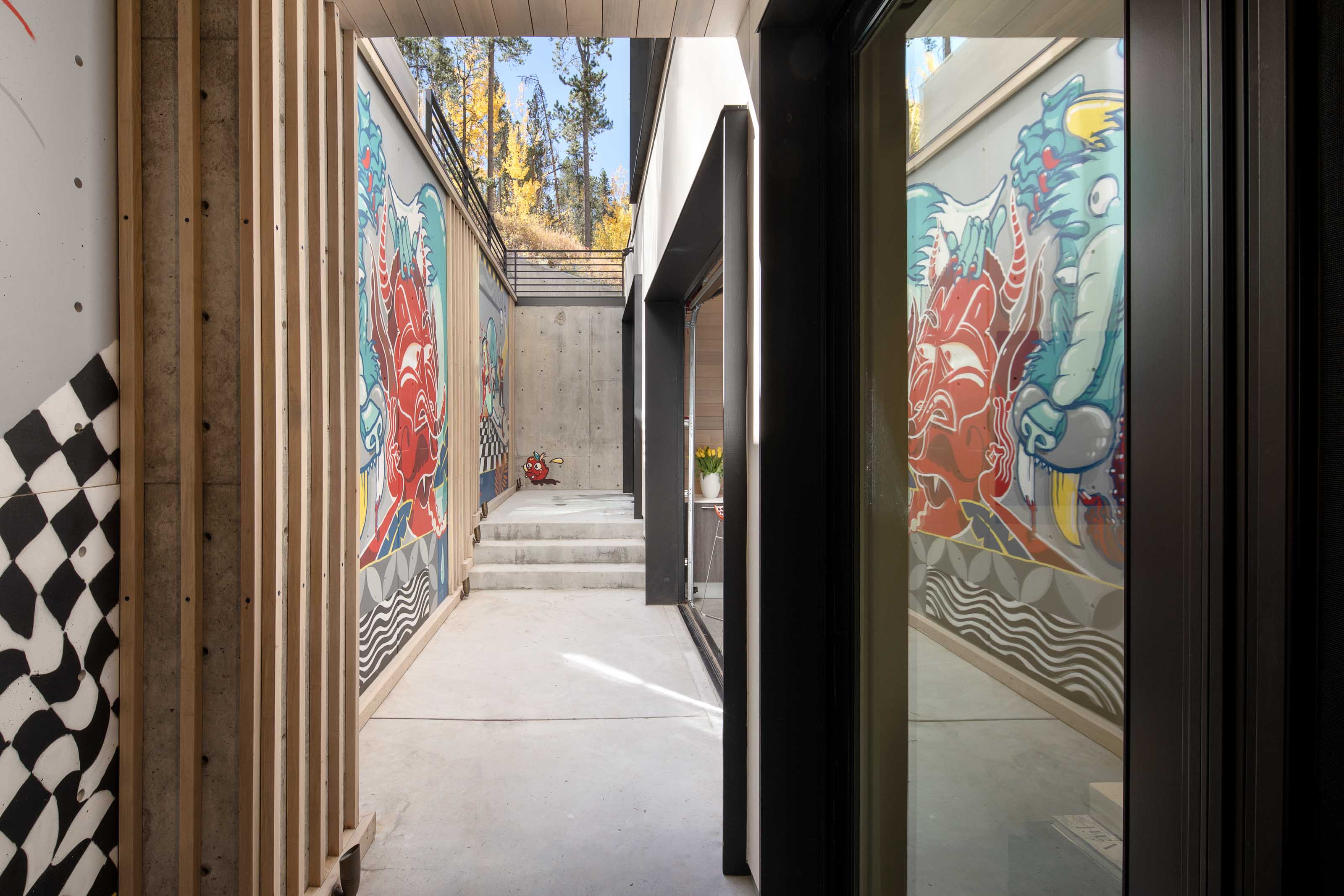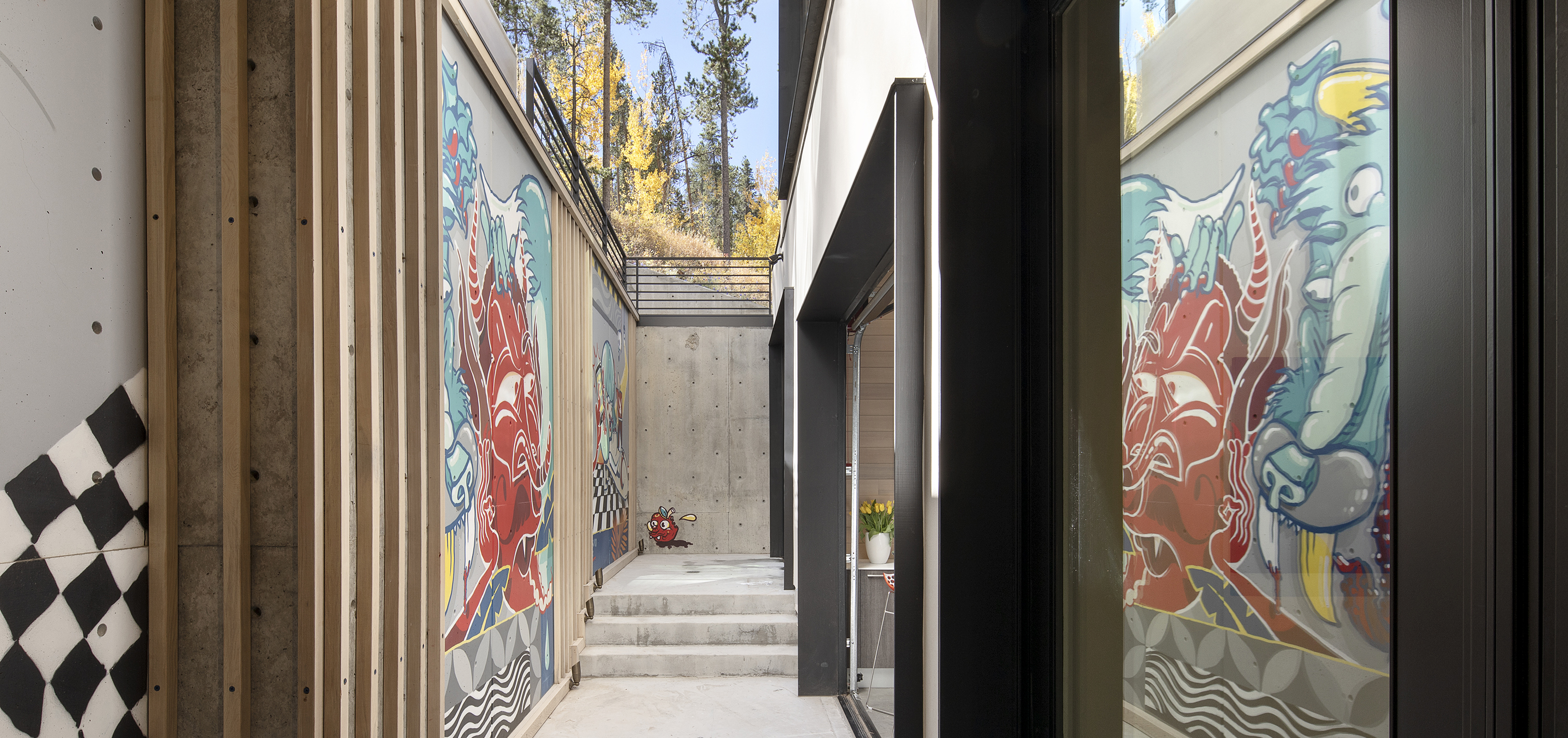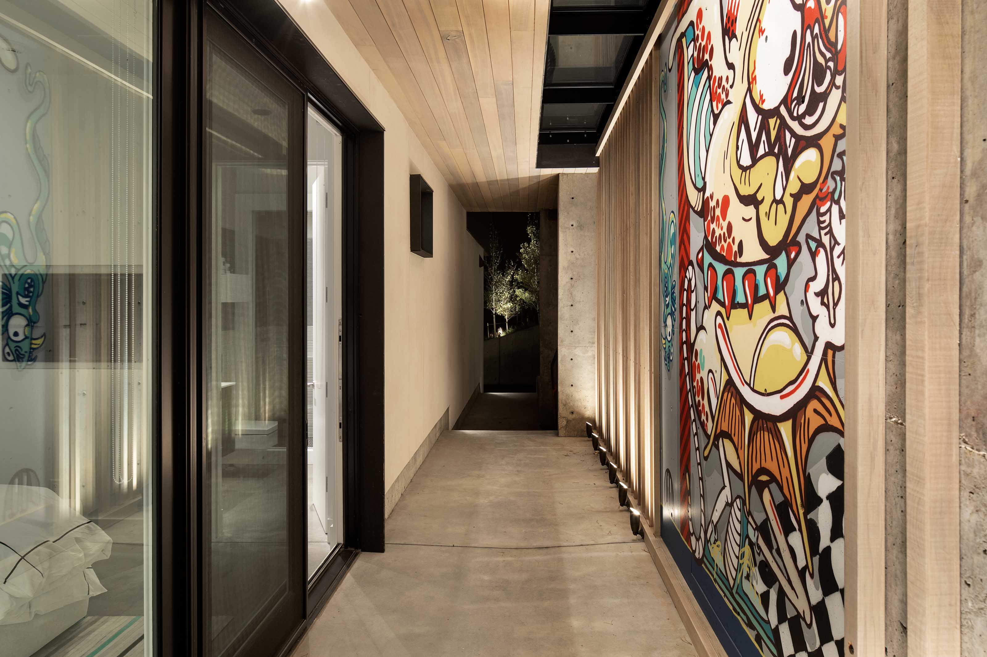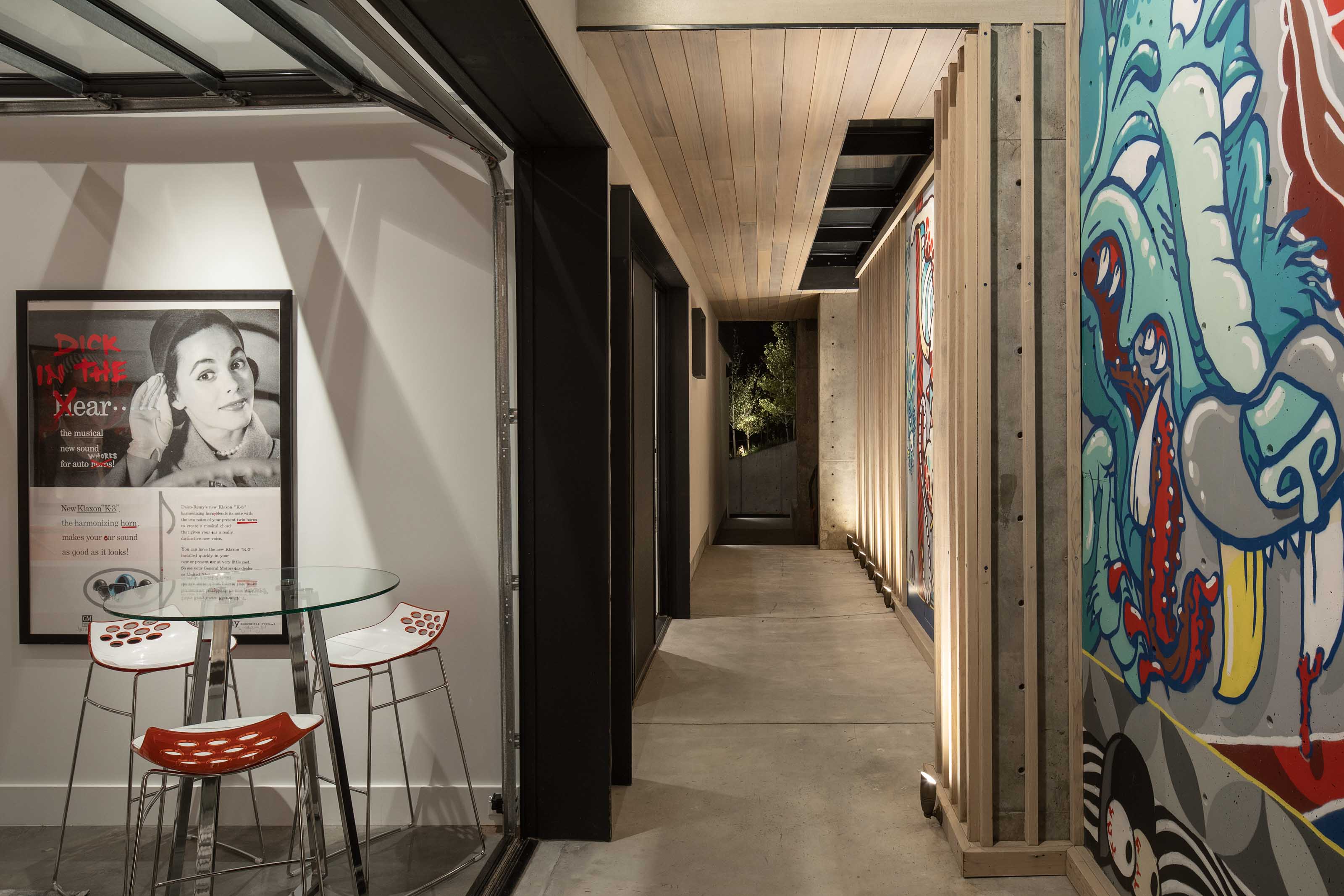 The larger of the two homes is nestled into the sloping hillside and features a partially subterranean bonus room and two bedrooms that look out on custom graffiti selected by the client. The master suite of the larger unit was established as one of the signature pieces of the home, cantilevering 12' from the main structure and creating a covered loggia adjacent to the great room below.