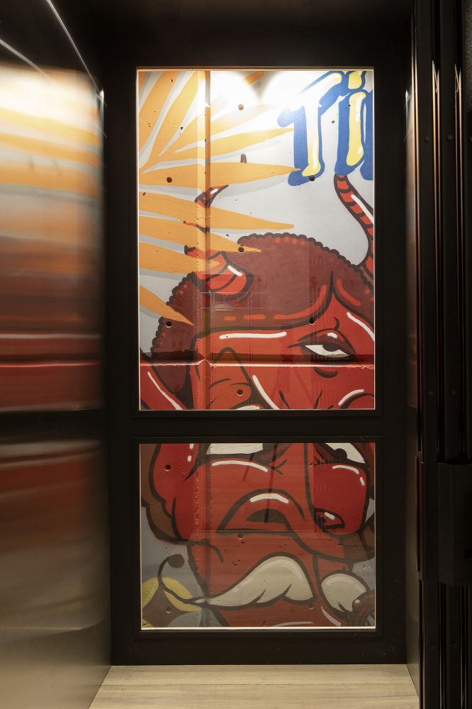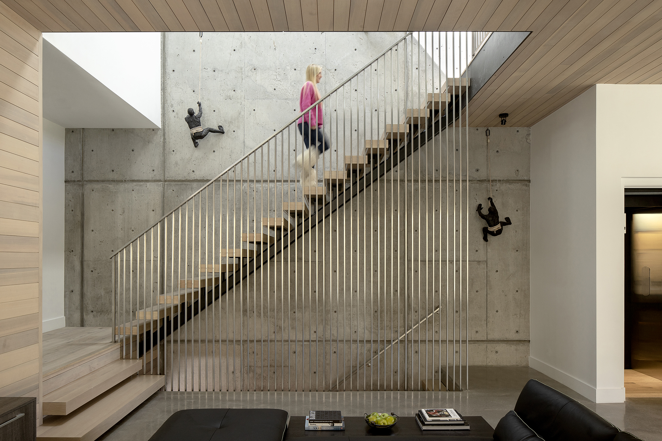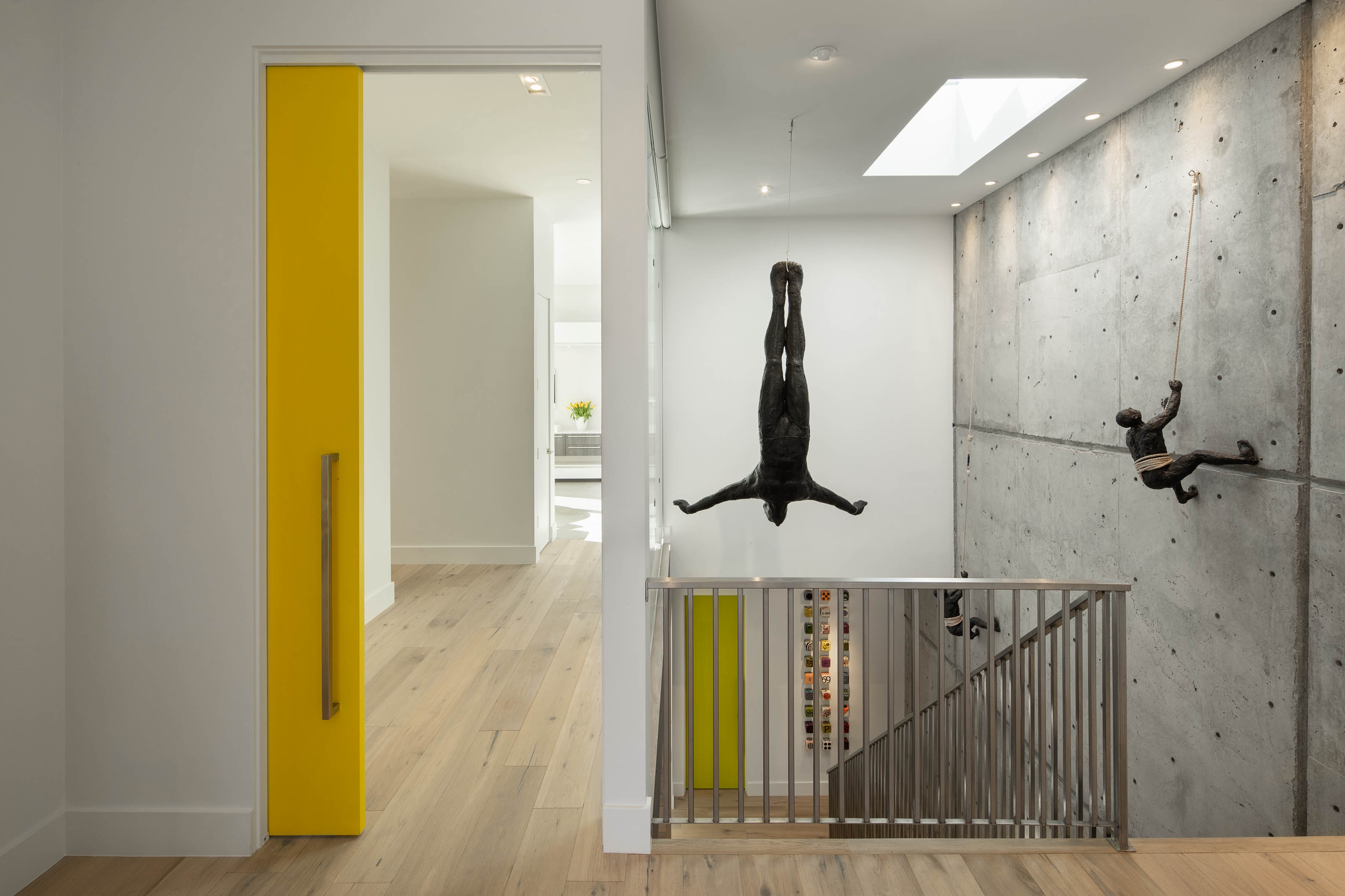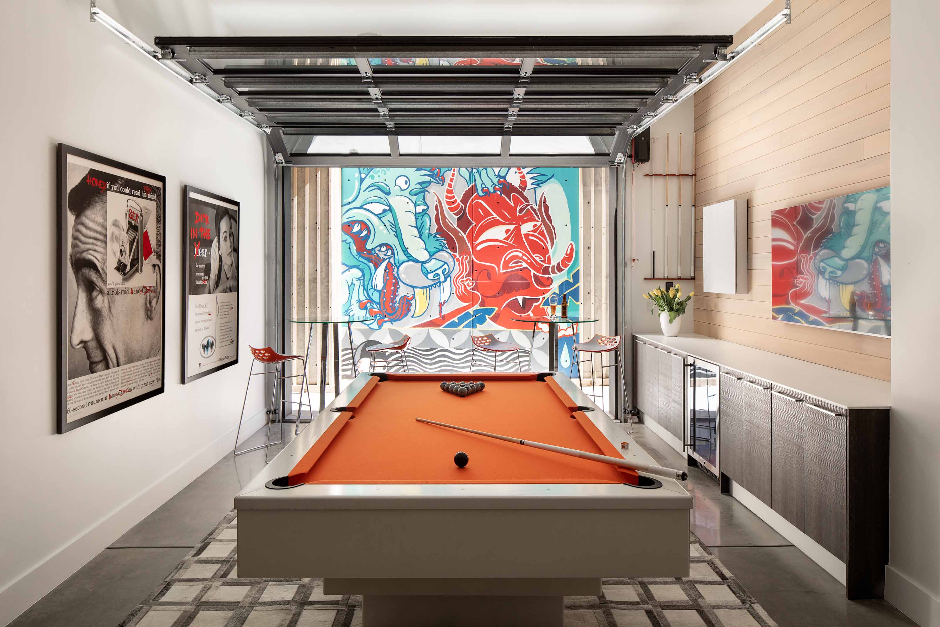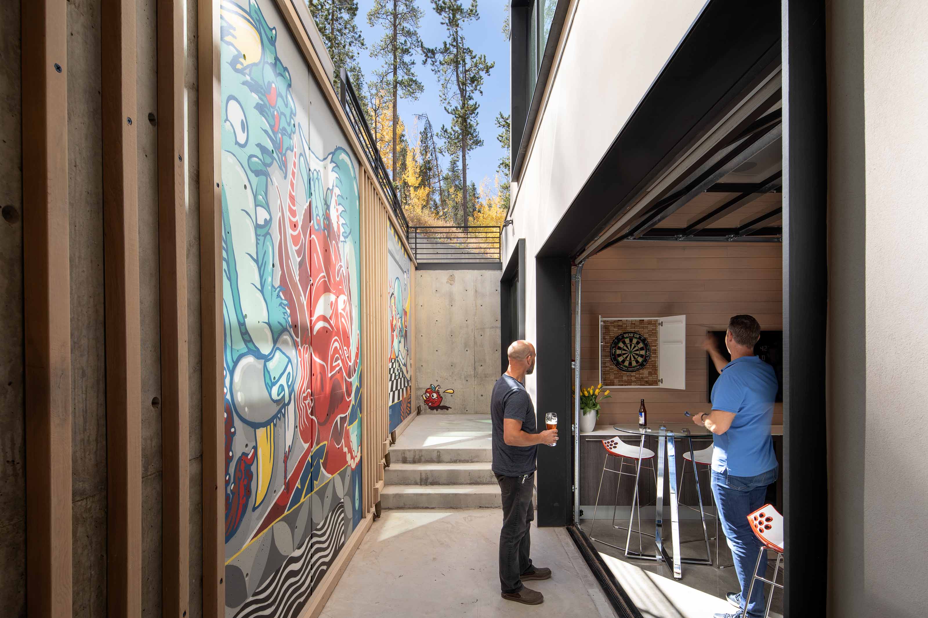 The larger of the two homes is nestled into the sloping hillside and features a partially subterranean bonus room and two bedrooms that look out on custom graffiti selected by the client. The master suite of the larger unit was established as one of the signature pieces of the home, cantilevering 12' from the main structure and creating a covered loggia adjacent to the great room below.