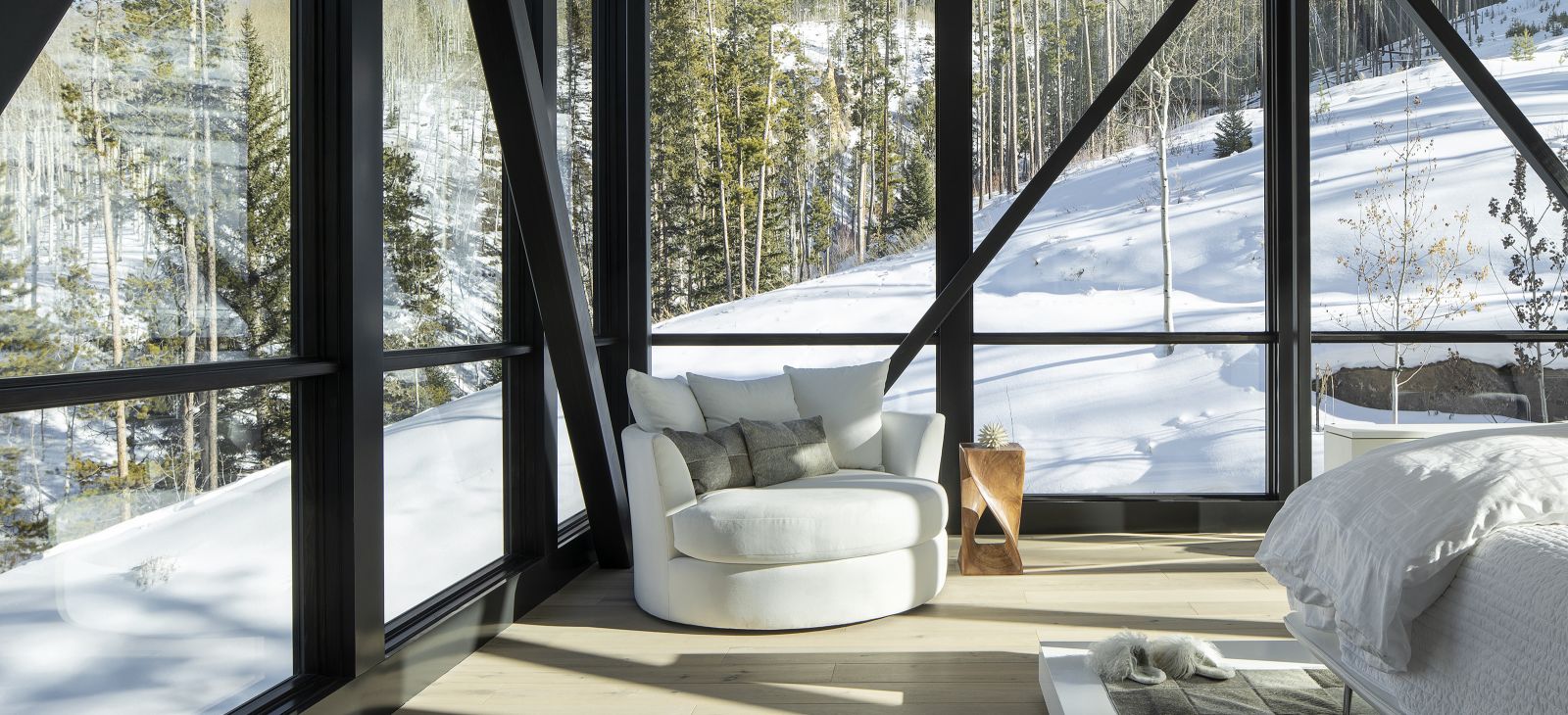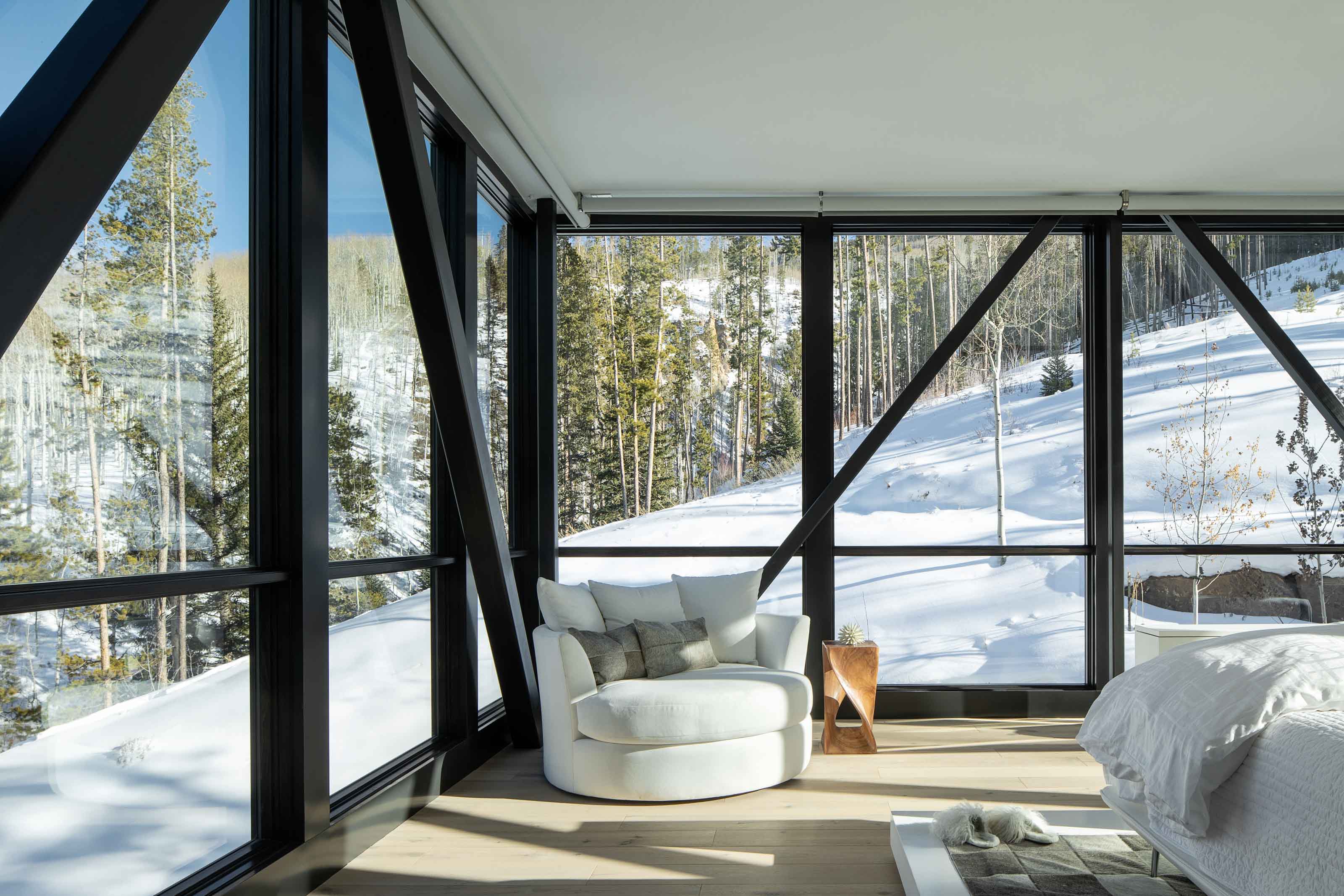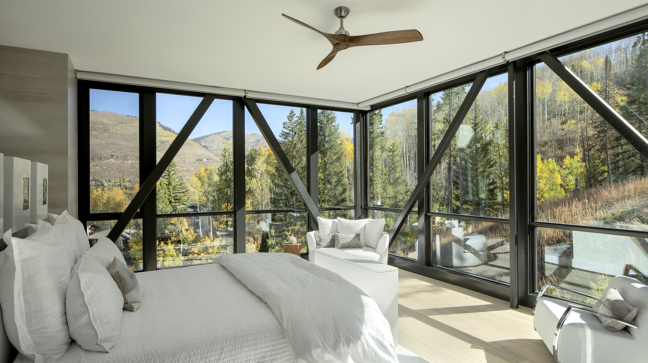The master bedroom reaches toward the hill, immersing those within into the seasons that define Colorado and the Rockies.