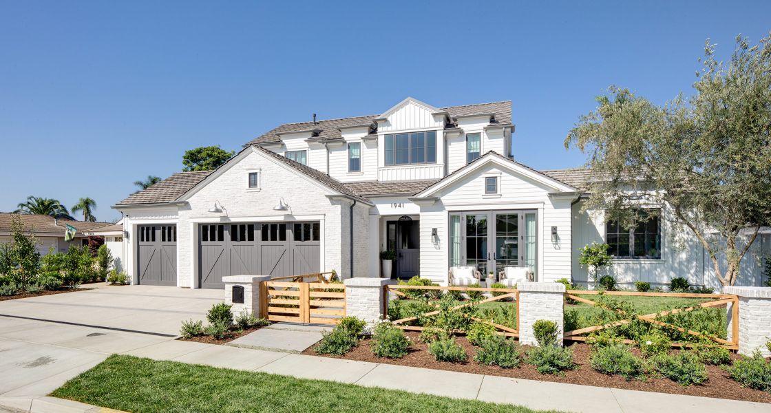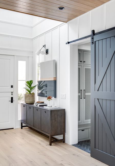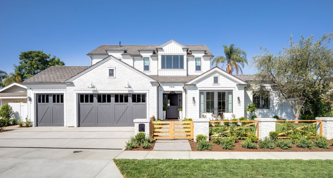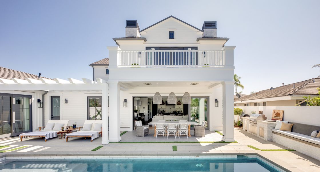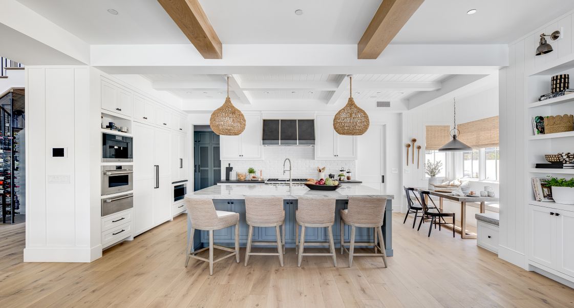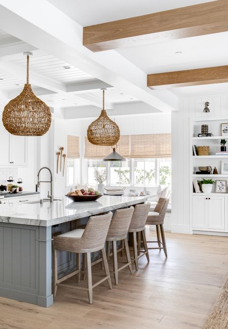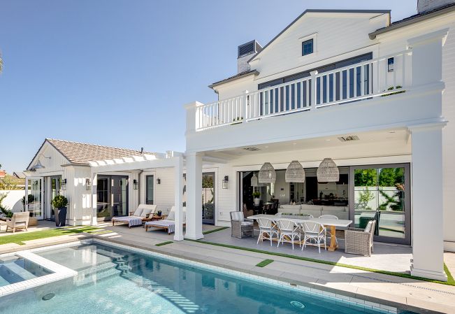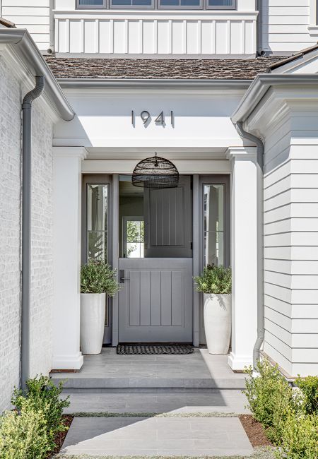 Newport Beach, CALocated near the Back Bay in Newport Beach, California, this sprawling two-story home accentuates the width of the lot and provides a stately curb-side appeal to the street. Inspired by a 'Pennsylvania Dutch' architectural style, this home blends modern and traditional design elements to create a timeless effect. Steep gable ends and flat shed roofs interplay to create a rhythm throughout the front of the home, which harmonizes the overall exterior. Rich materials such as white-washed brick, board and batten vertical siding, wood clapboard siding, and metal standing seam roofs pair well with the decorative wood trim detailing and steel-grey frames around the windows.