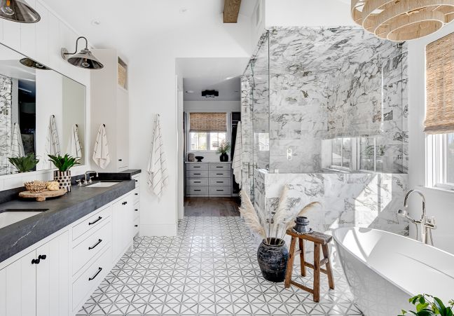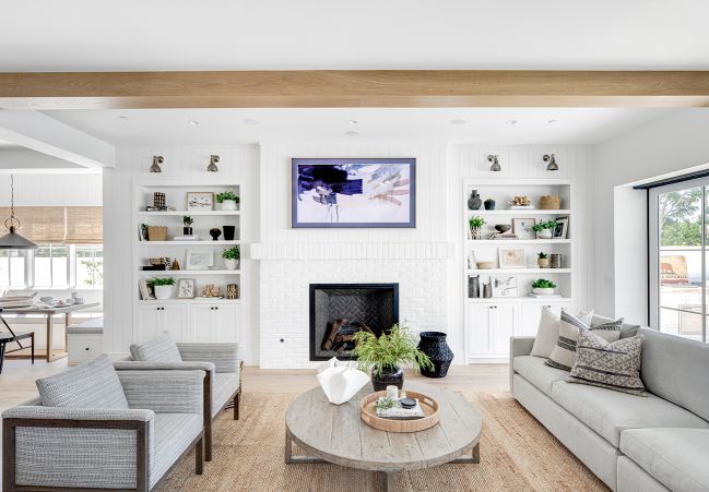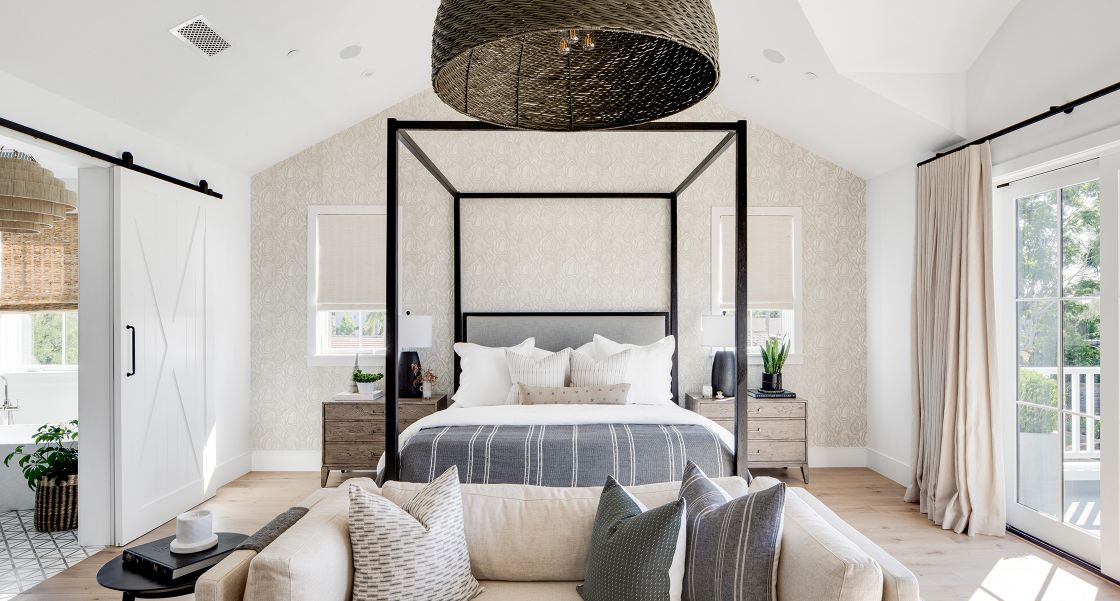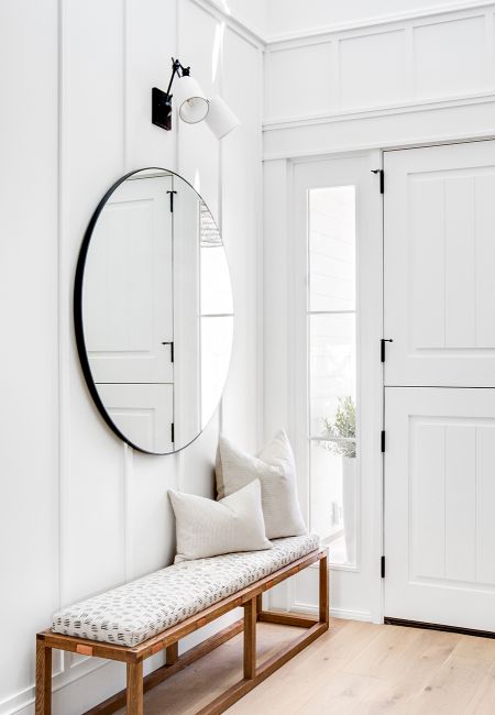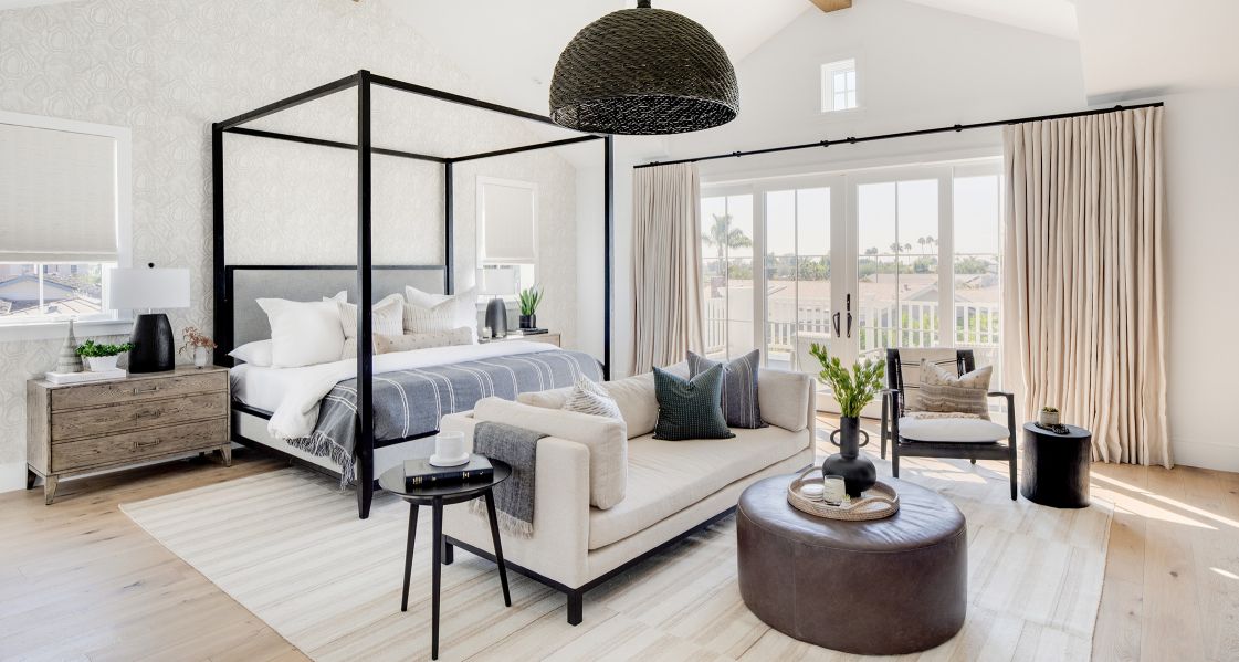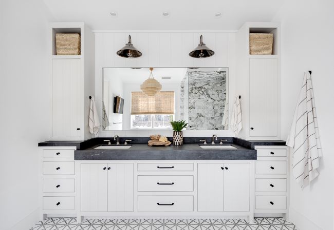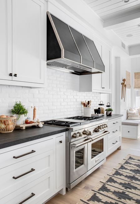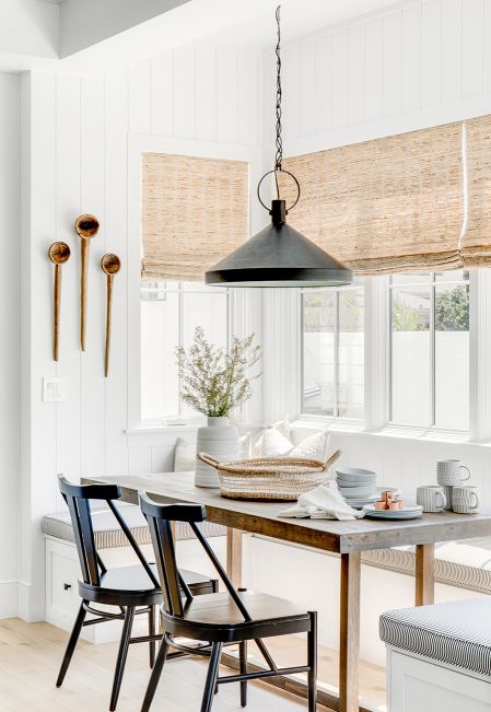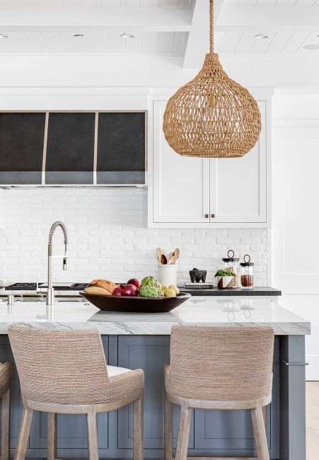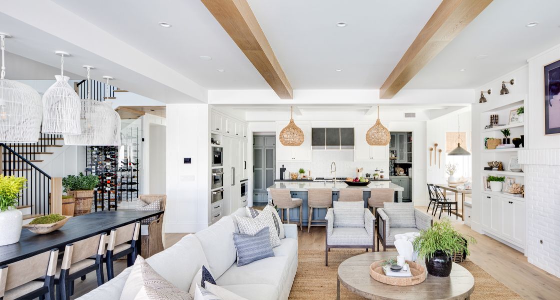 Newport Beach, CALocated near the Back Bay in Newport Beach, California, this sprawling two-story home accentuates the width of the lot and provides a stately curb-side appeal to the street. Inspired by a 'Pennsylvania Dutch' architectural style, this home blends modern and traditional design elements to create a timeless effect. Steep gable ends and flat shed roofs interplay to create a rhythm throughout the front of the home, which harmonizes the overall exterior. Rich materials such as white-washed brick, board and batten vertical siding, wood clapboard siding, and metal standing seam roofs pair well with the decorative wood trim detailing and steel-grey frames around the windows.