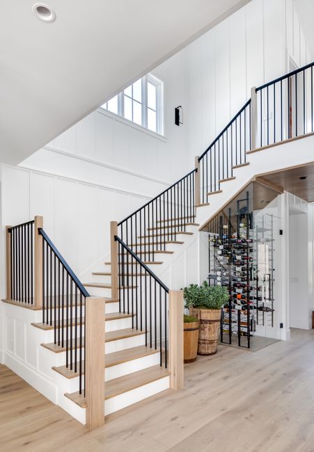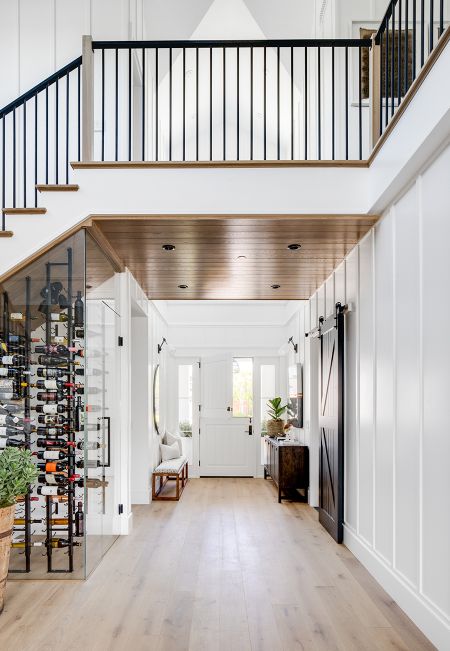 Inside, double-height spaces in the foyer and center of the house flood the home with natural light, accentuating the warm aesthetic of light wood flooring, white walls, and bold metal detailing.
