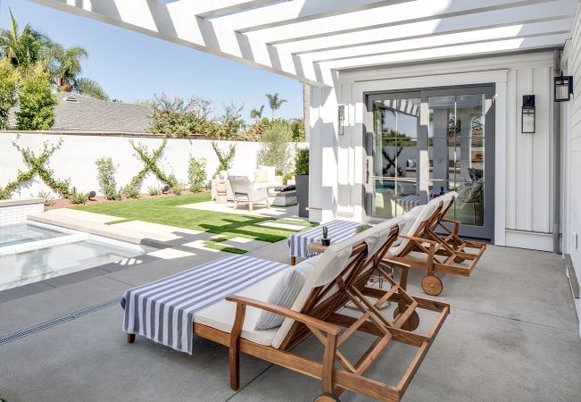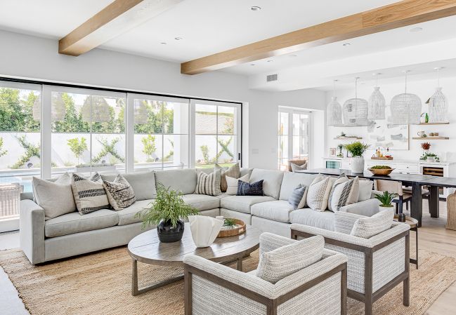 At the rear of the home, large sliding glass doors open onto a spacious outdoor dining and lounge area, blurring the line between indoor and outdoor living and allowing natural light into the main room